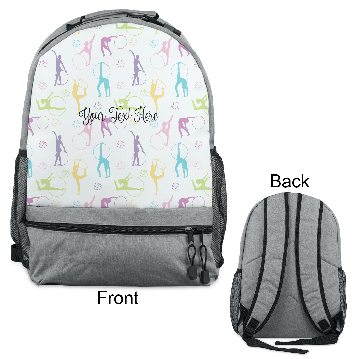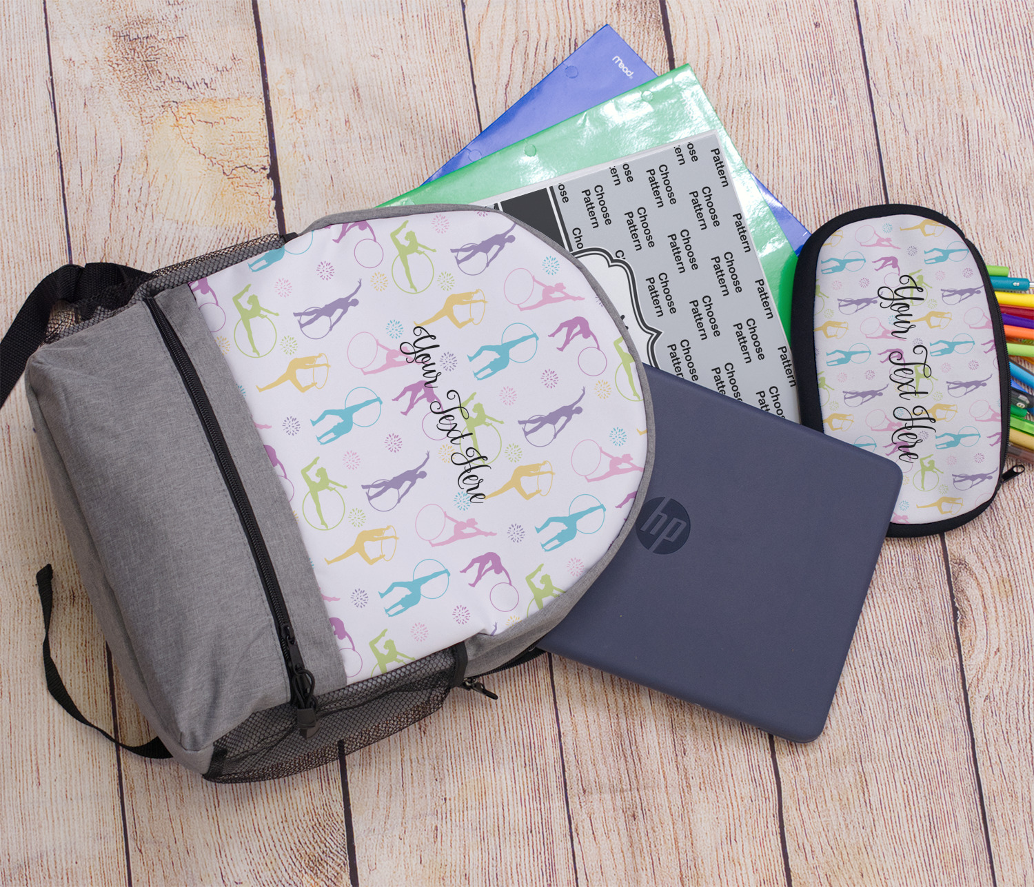 This design template is perfect for gymnasts, their friends and family. The main design features a pattern with gymnasts in pastel colors, some flowers and a white background. The optional personalization is name / text.
