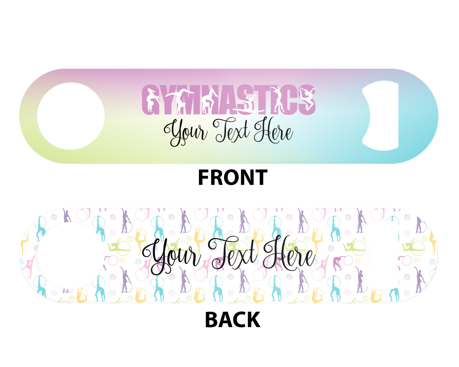 This design template is perfect for gymnasts, their friends and family. The main design features a pattern with gymnasts in pastel colors, some flowers and a white background. The optional personalization is name / text.