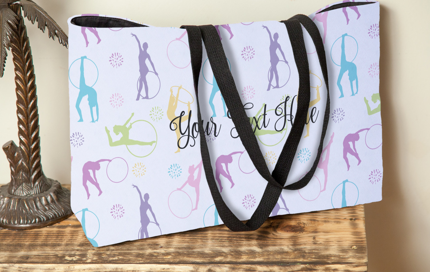 This design template is perfect for gymnasts, their friends and family. The main design features a pattern with gymnasts in pastel colors, some flowers and a white background. The optional personalization is name / text.