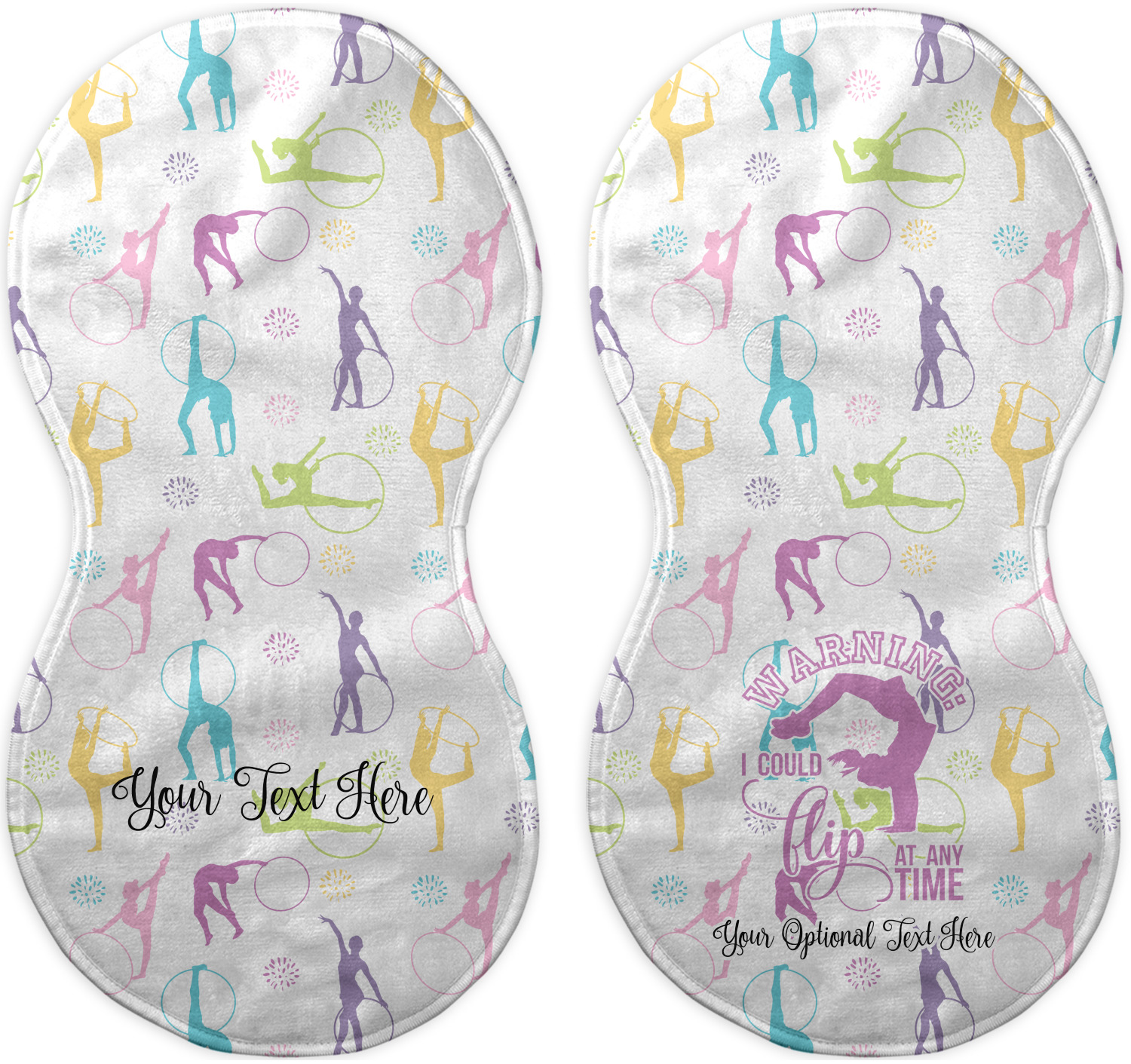 This design template is perfect for gymnasts, their friends and family. The main design features a pattern with gymnasts in pastel colors, some flowers and a white background. The optional personalization is name / text.