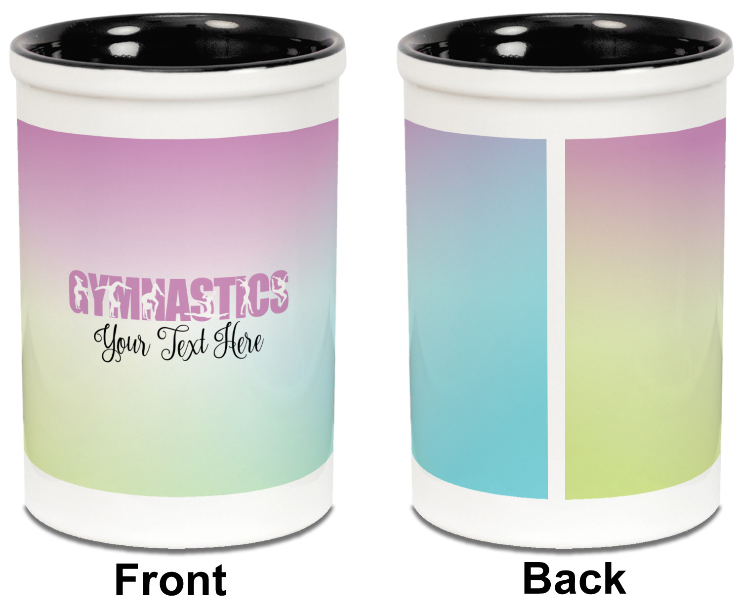 This design template is perfect for gymnasts, their friends and family. The main design features a pattern with gymnasts in pastel colors, some flowers and a white background. The optional personalization is name / text.