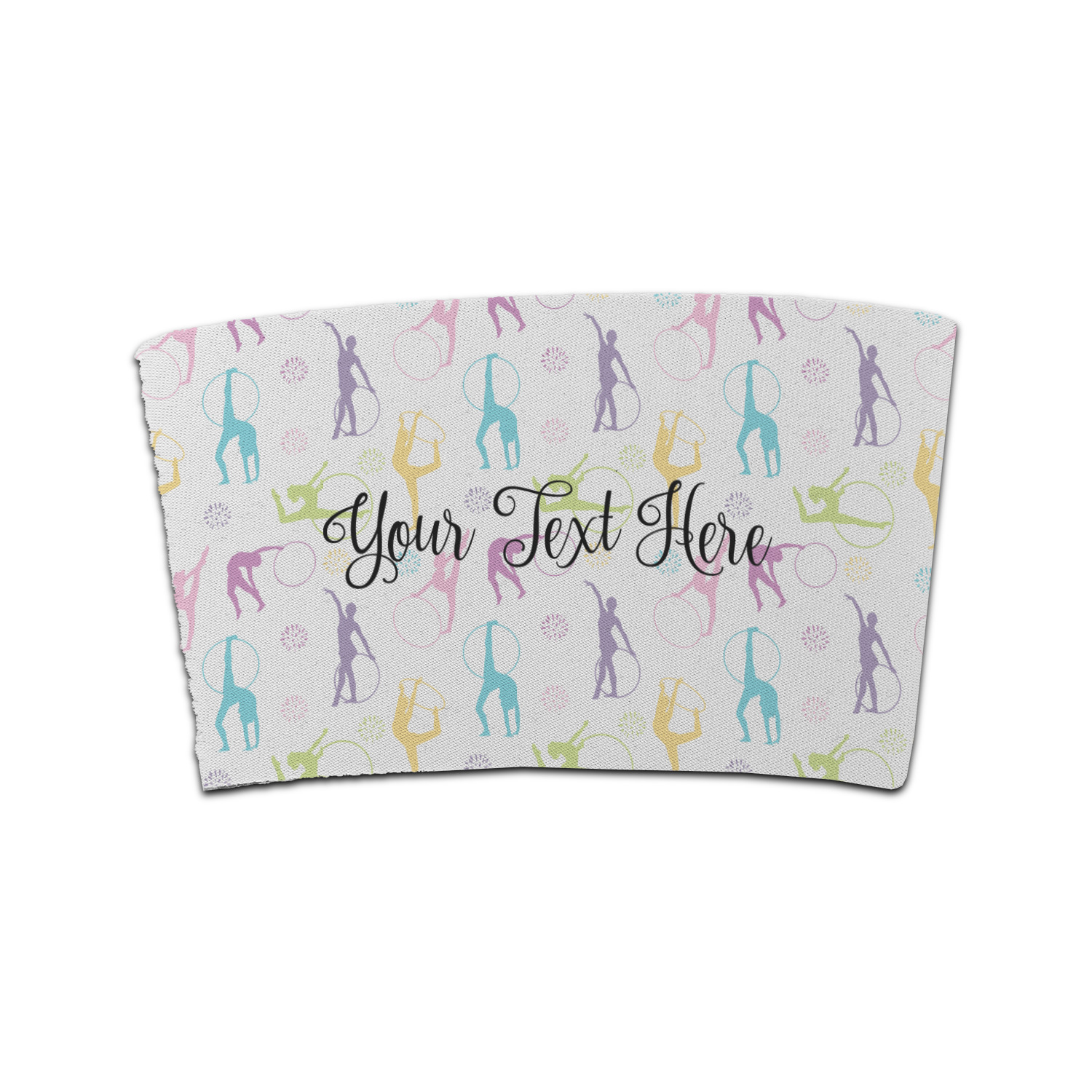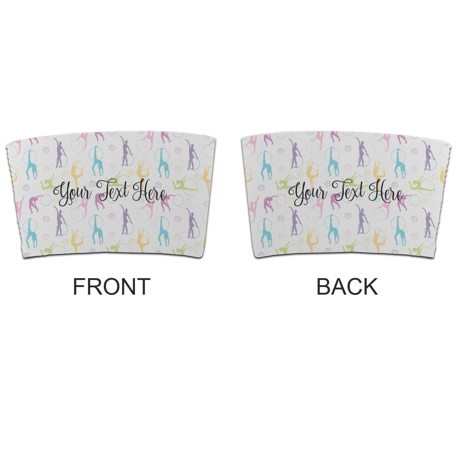 This design template is perfect for gymnasts, their friends and family. The main design features a pattern with gymnasts in pastel colors, some flowers and a white background. The optional personalization is name / text.