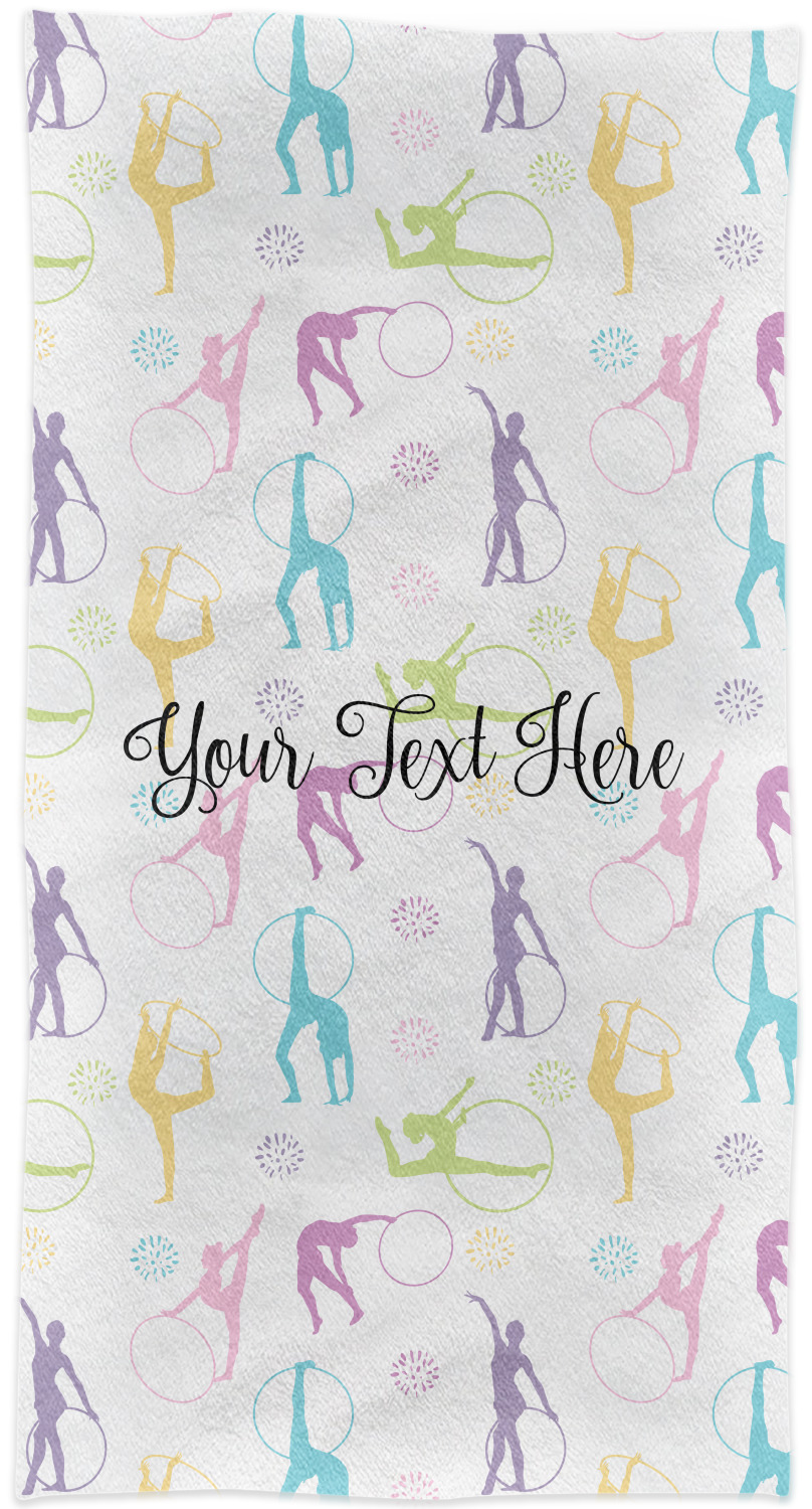 This design template is perfect for gymnasts, their friends and family. The main design features a pattern with gymnasts in pastel colors, some flowers and a white background. The optional personalization is name / text.