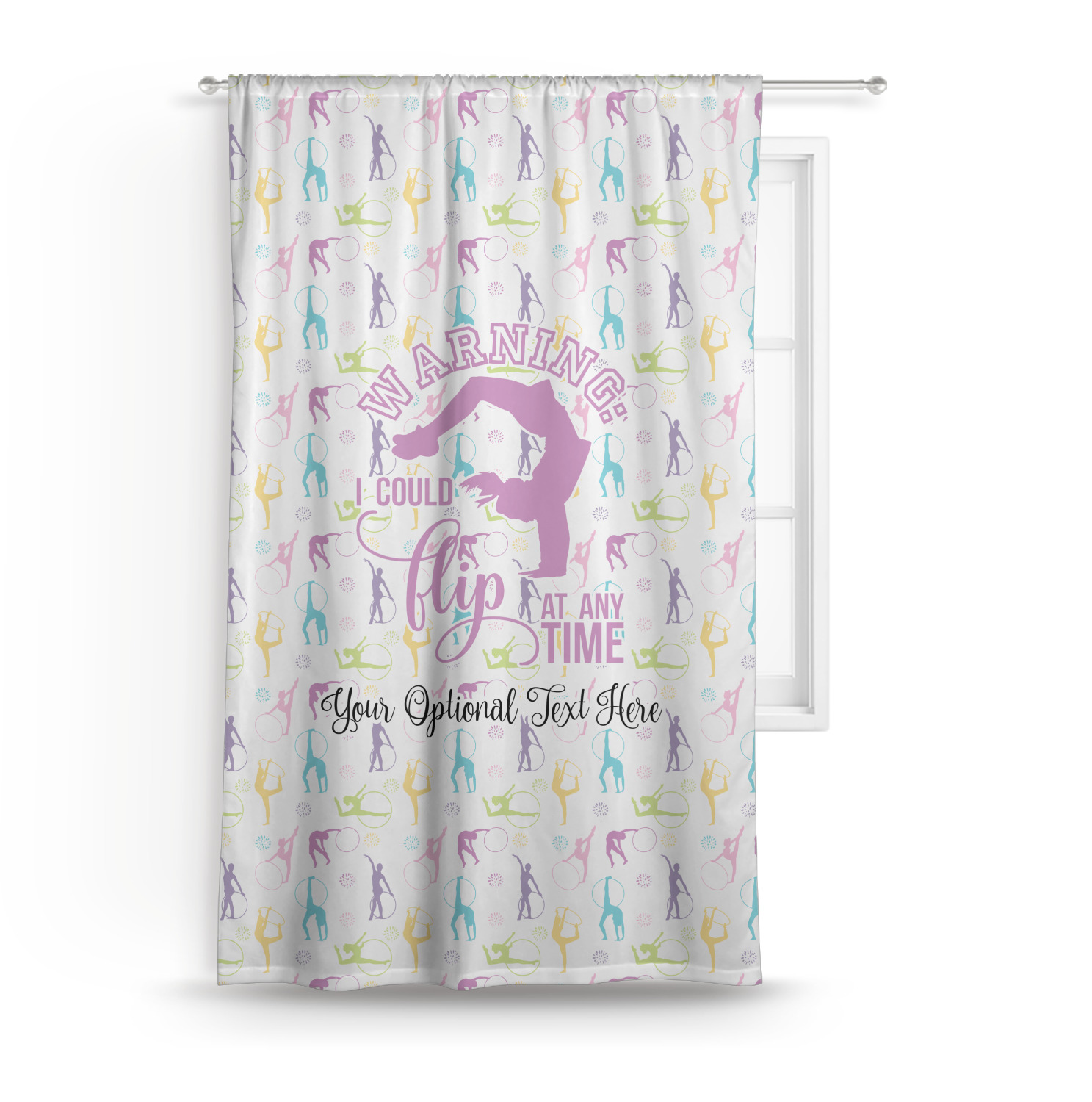 This design template is perfect for gymnasts, their friends and family. The main design features a pattern with gymnasts in pastel colors, some flowers and a white background. The optional personalization is name / text.