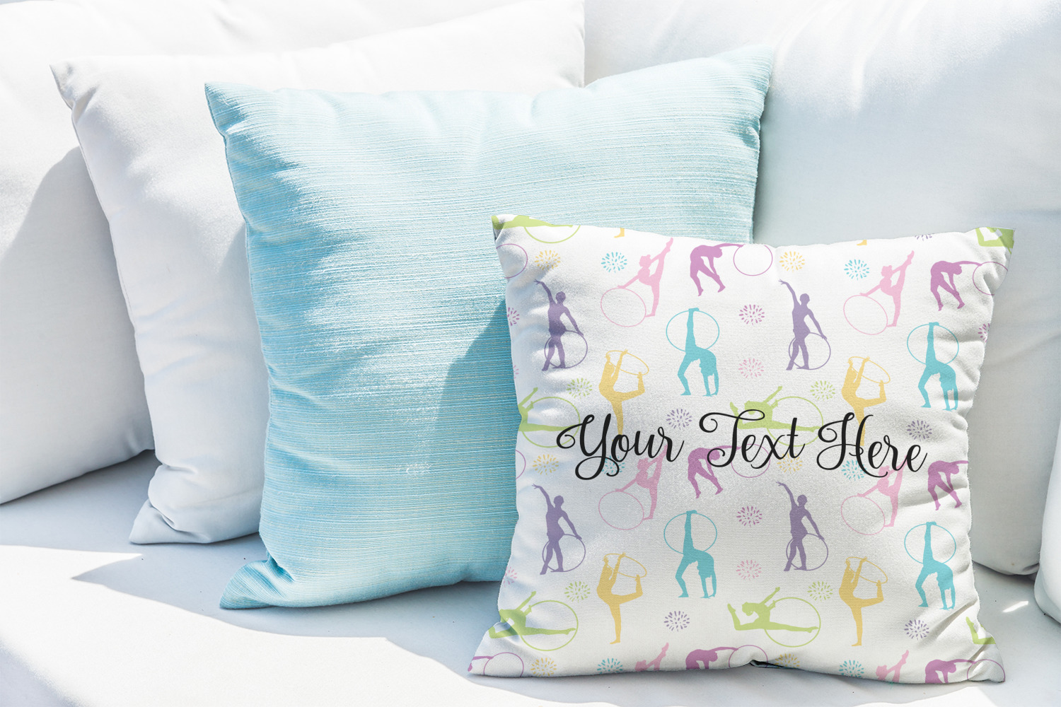 This design template is perfect for gymnasts, their friends and family. The main design features a pattern with gymnasts in pastel colors, some flowers and a white background. The optional personalization is name / text.