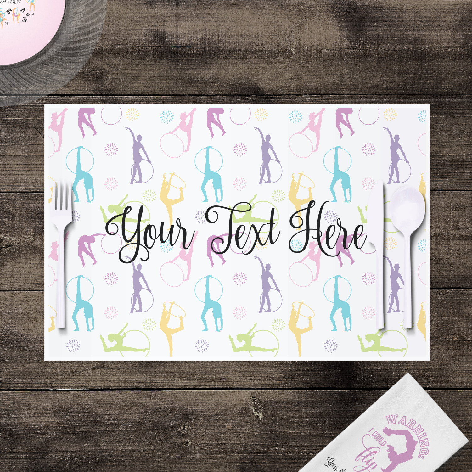 This design template is perfect for gymnasts, their friends and family. The main design features a pattern with gymnasts in pastel colors, some flowers and a white background. The optional personalization is name / text.