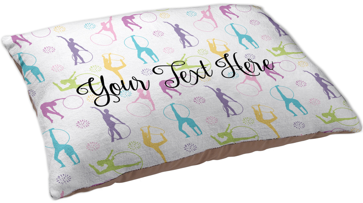 This design template is perfect for gymnasts, their friends and family. The main design features a pattern with gymnasts in pastel colors, some flowers and a white background. The optional personalization is name / text.