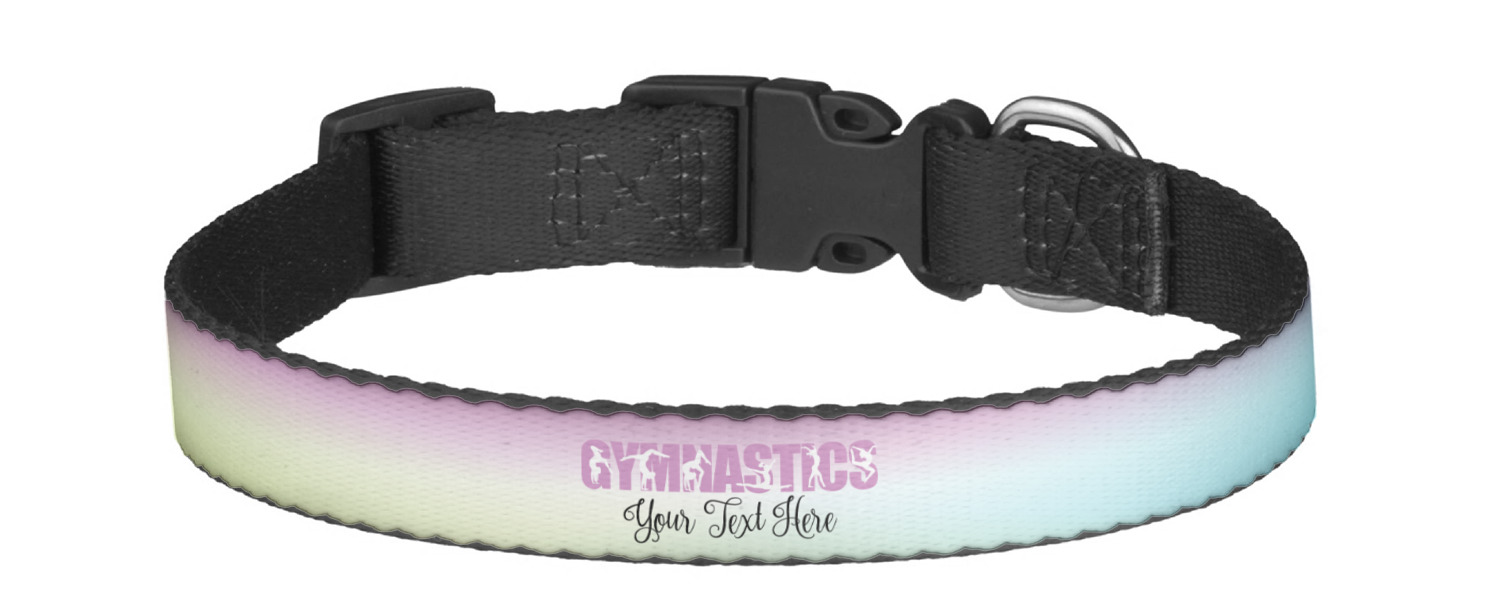 This sturdy collar, made from a durable nylon weave, will outlive your dog's episodes of excited tugging and pulling. Courtesy of its thick plastic buckle and adjuster, this collar is adjustable and accommodating of any dog. Structurally, the collar is a single piece of nylon weave that is sewn together, and features a solid metal loop where you can attach a leash or dog tag. We print and display your dog's name and pattern across the middle of the personalized dog collar.