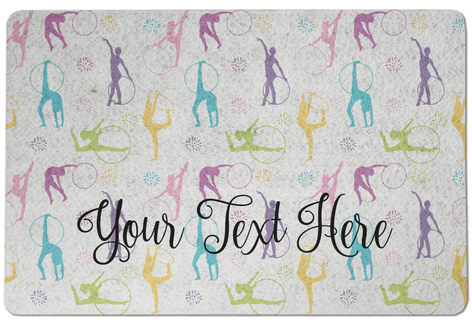 This design template is perfect for gymnasts, their friends and family. The main design features a pattern with gymnasts in pastel colors, some flowers and a white background. The optional personalization is name / text.