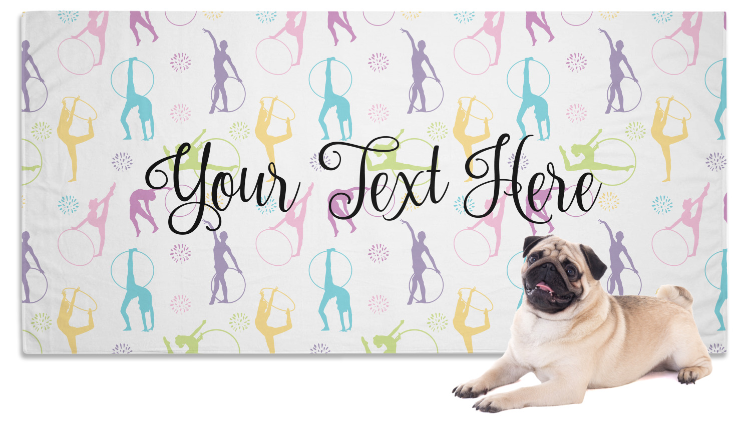 This design template is perfect for gymnasts, their friends and family. The main design features a pattern with gymnasts in pastel colors, some flowers and a white background. The optional personalization is name / text.