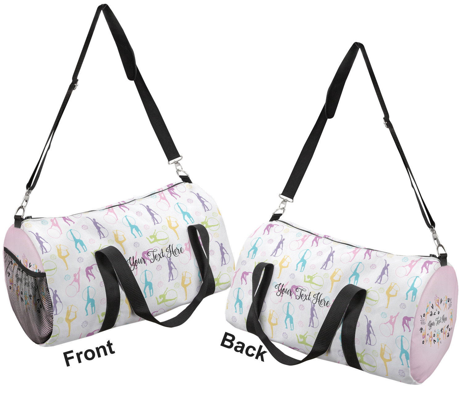 This duffle is a sturdy bag made of a canvas material. It comes in two sizes: Small (19"W x 9.5"H x 9.5"D) and Large (23"W x 12"H x 12"D). The bag is a cylindrical shape with a black adjustable strap and two handles. On one side is an elastic pouch to put a waterbottle or other small item. Your product will be sublimated with your design and is able to be designed on the front, back, and sides. Be sure to remember that the straps may cut into parts of your design if you upload your own artwork.