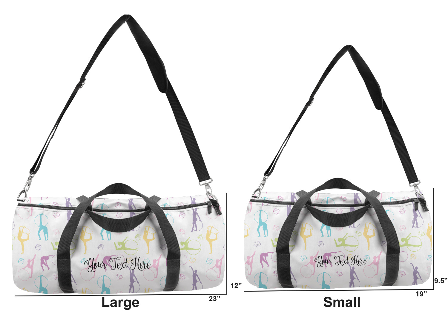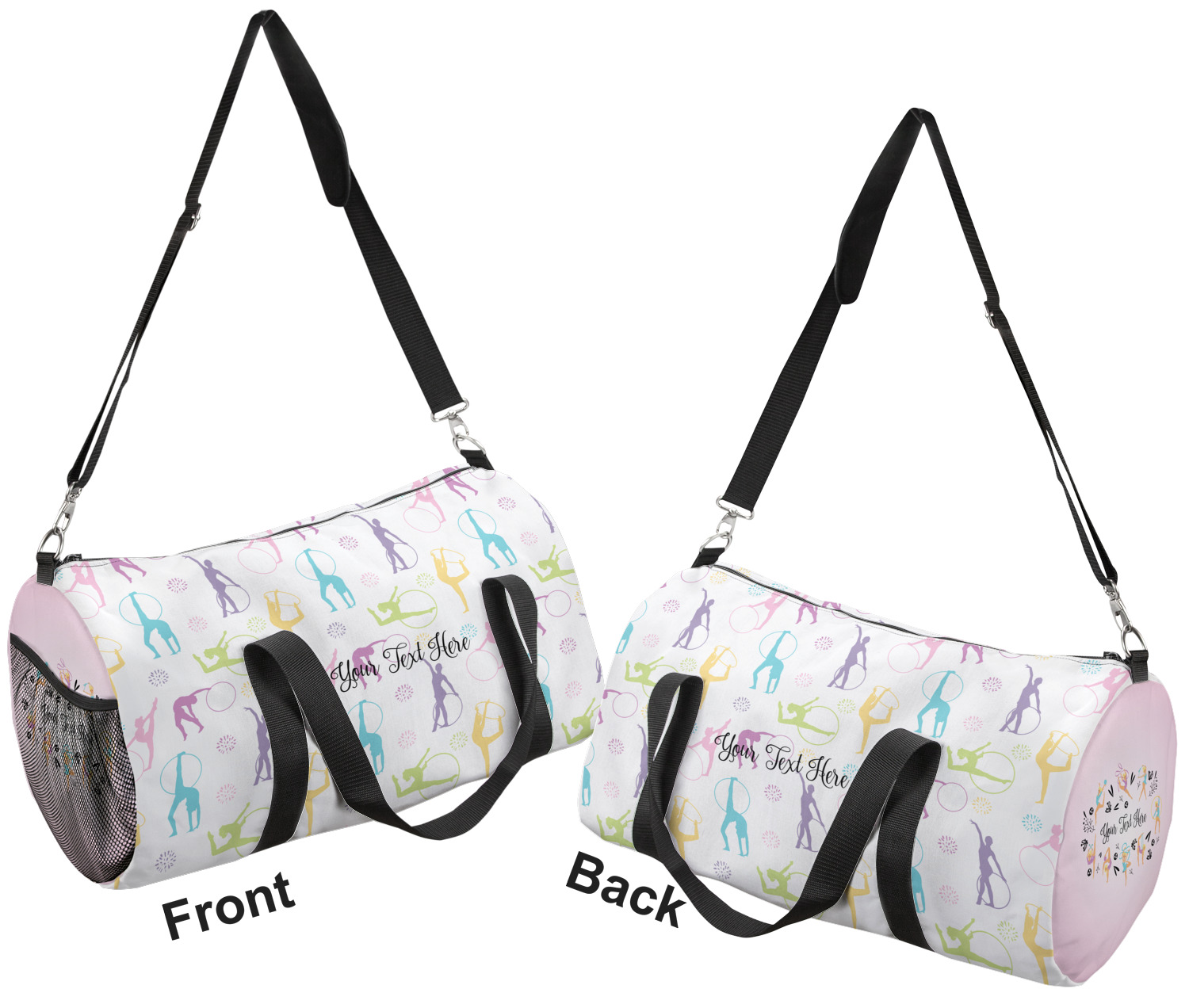 This duffle is a sturdy bag made of a canvas material. It comes in two sizes: Small (19"W x 9.5"H x 9.5"D) and Large (23"W x 12"H x 12"D). The bag is a cylindrical shape with a black adjustable strap and two handles. On one side is an elastic pouch to put a waterbottle or other small item. Your product will be sublimated with your design and is able to be designed on the front, back, and sides. Be sure to remember that the straps may cut into parts of your design if you upload your own artwork.