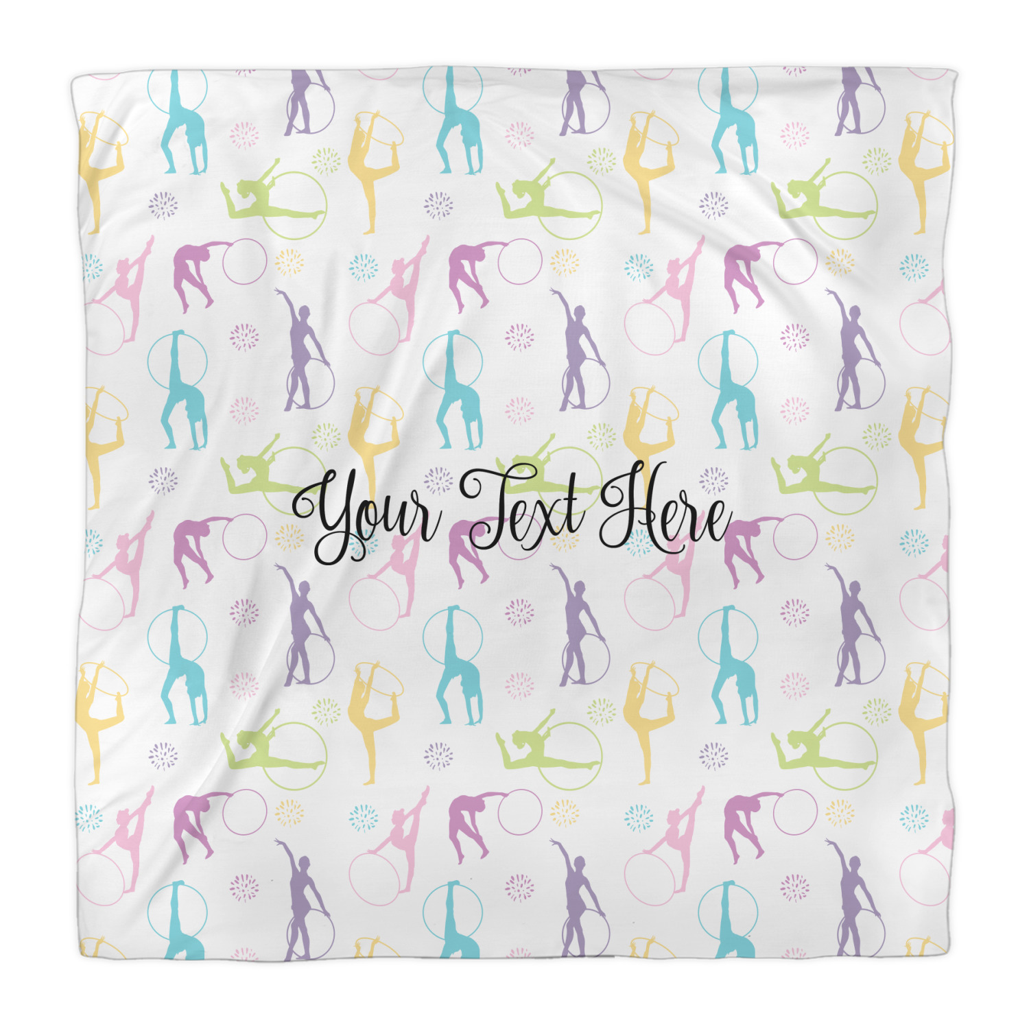 This design template is perfect for gymnasts, their friends and family. The main design features a pattern with gymnasts in pastel colors, some flowers and a white background. The optional personalization is name / text.