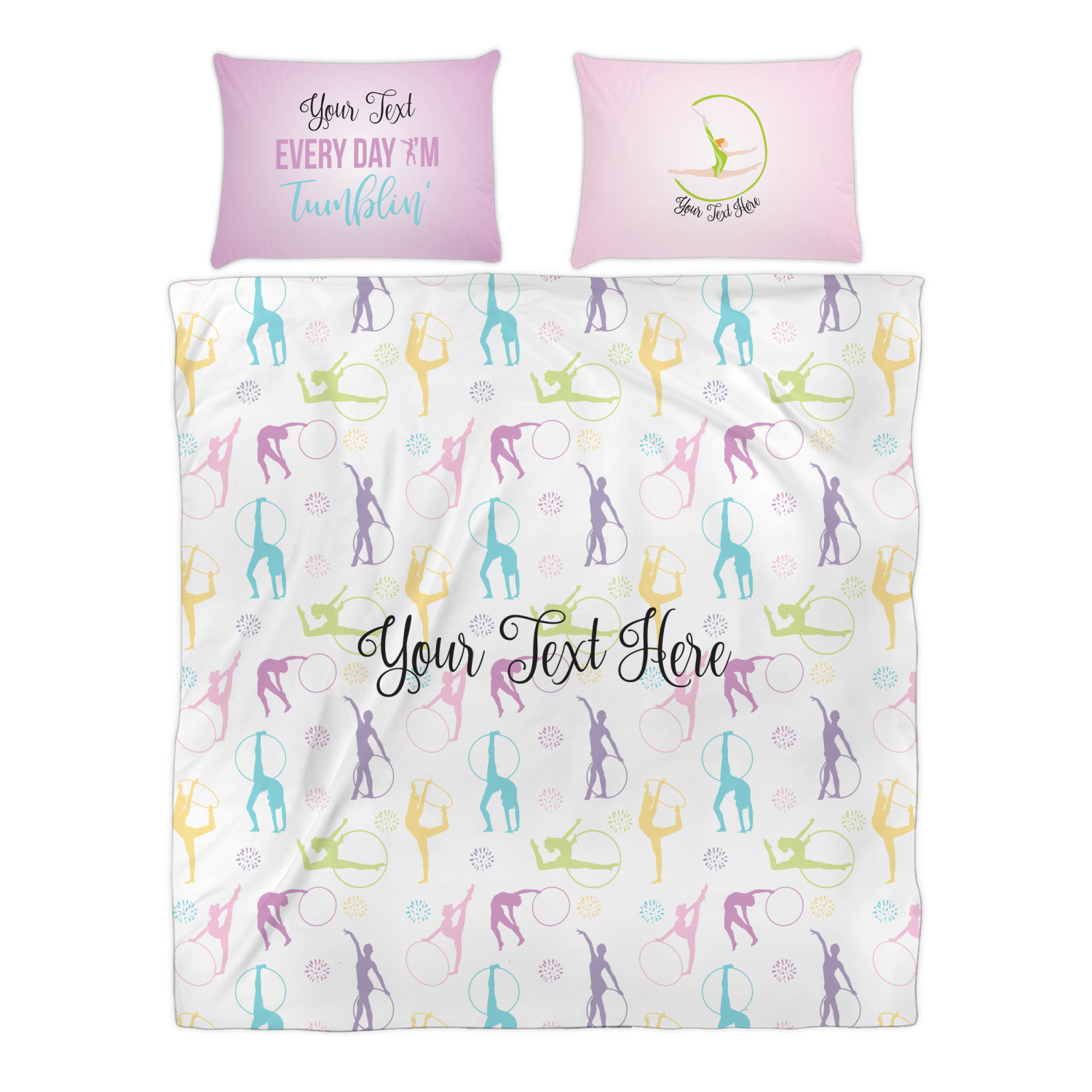 This design template is perfect for gymnasts, their friends and family. The main design features a pattern with gymnasts in pastel colors, some flowers and a white background. The optional personalization is name / text.