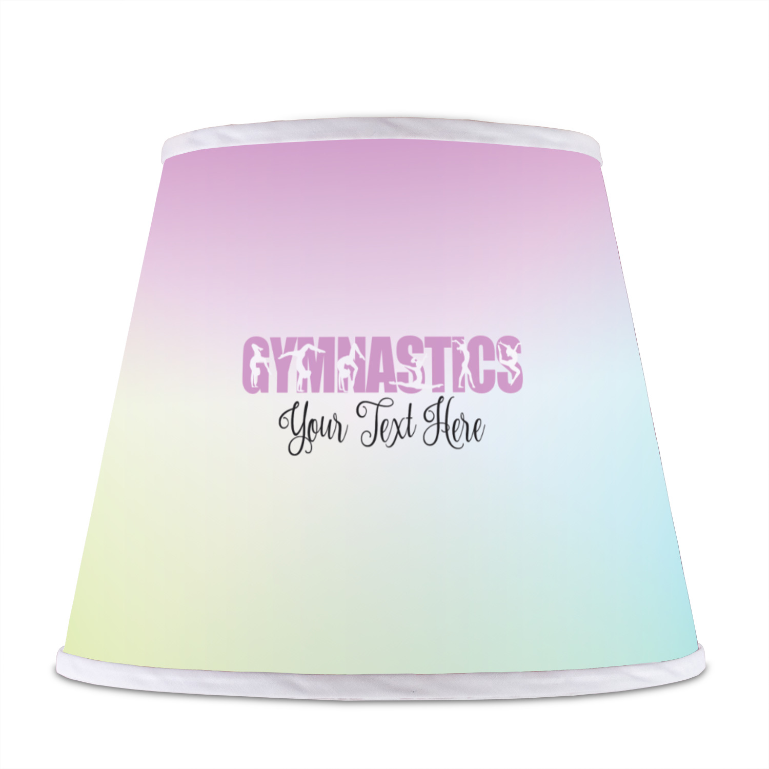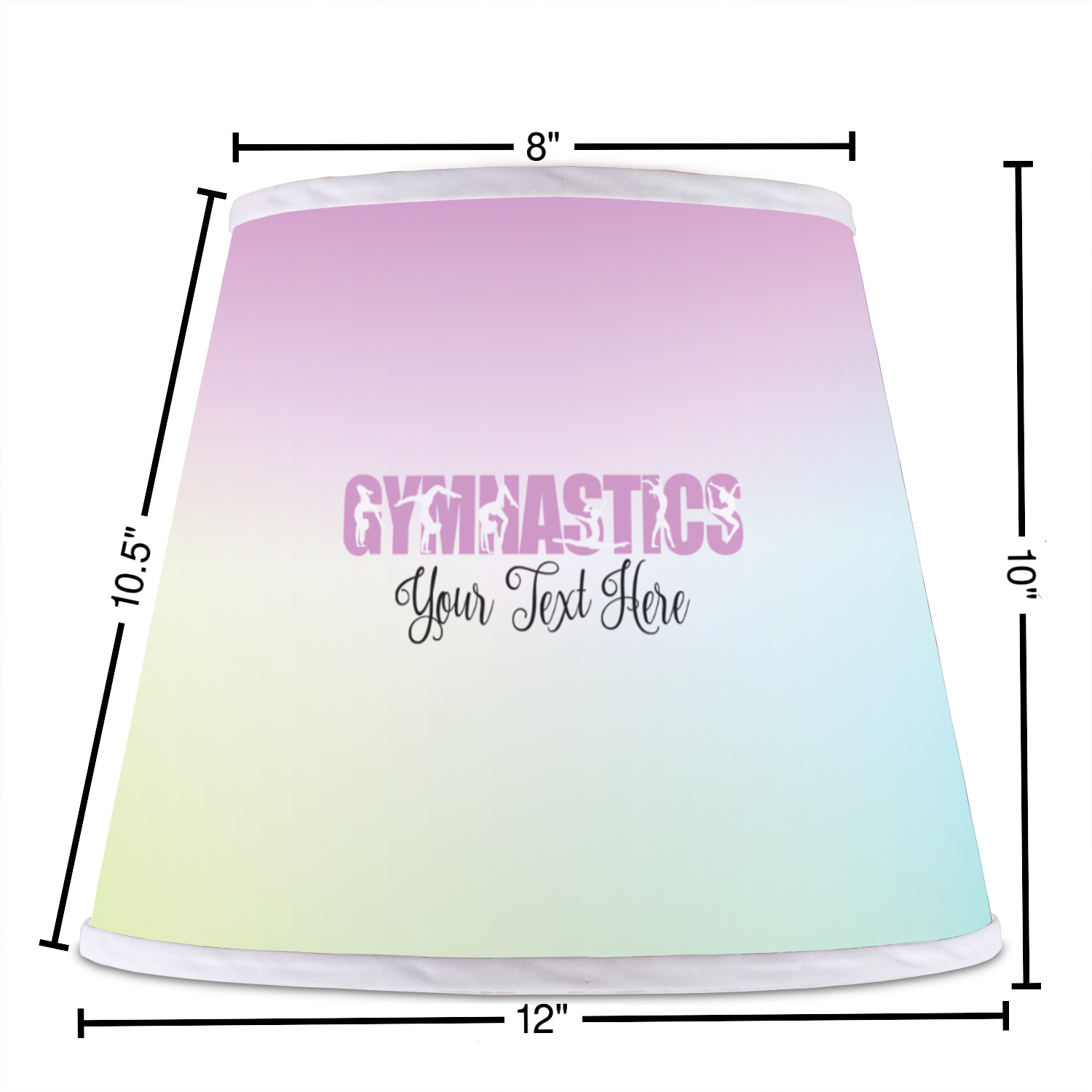 The base of this lampshade is 12 inches in diameter, and the top spans 8 inches in diameter. The total height of the lampshade is 10 inches. The angled nature of this custom lampshade concentrates the light, making it ideal for smaller spaces. This lampshade is made of matte, polyfilm, and displays your customization in its middle. The top and bottom of this colorful lamp shade are lined with a white fabric ribbon (which can be replaced with black inside the design studio) which frames your design and creates a sophisticated finish. As an UNO fitter lampshade, this unique lamp shade will fit a variety of bases.