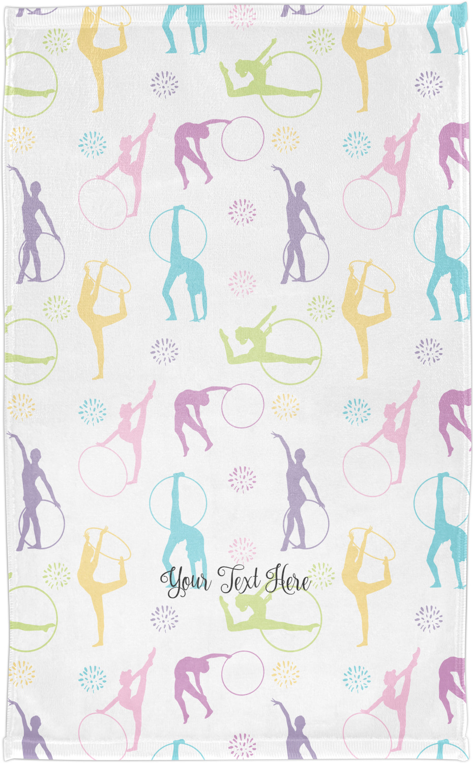 This design template is perfect for gymnasts, their friends and family. The main design features a pattern with gymnasts in pastel colors, some flowers and a white background. The optional personalization is name / text.