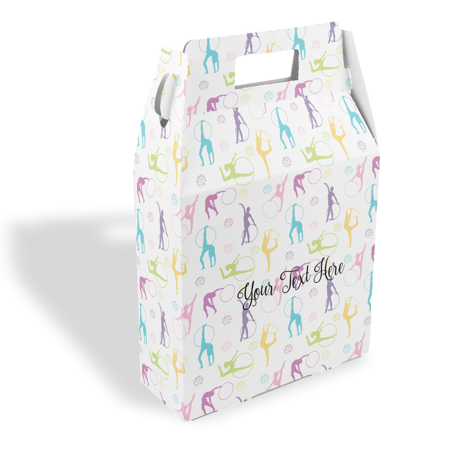 This design template is perfect for gymnasts, their friends and family. The main design features a pattern with gymnasts in pastel colors, some flowers and a white background. The optional personalization is name / text.