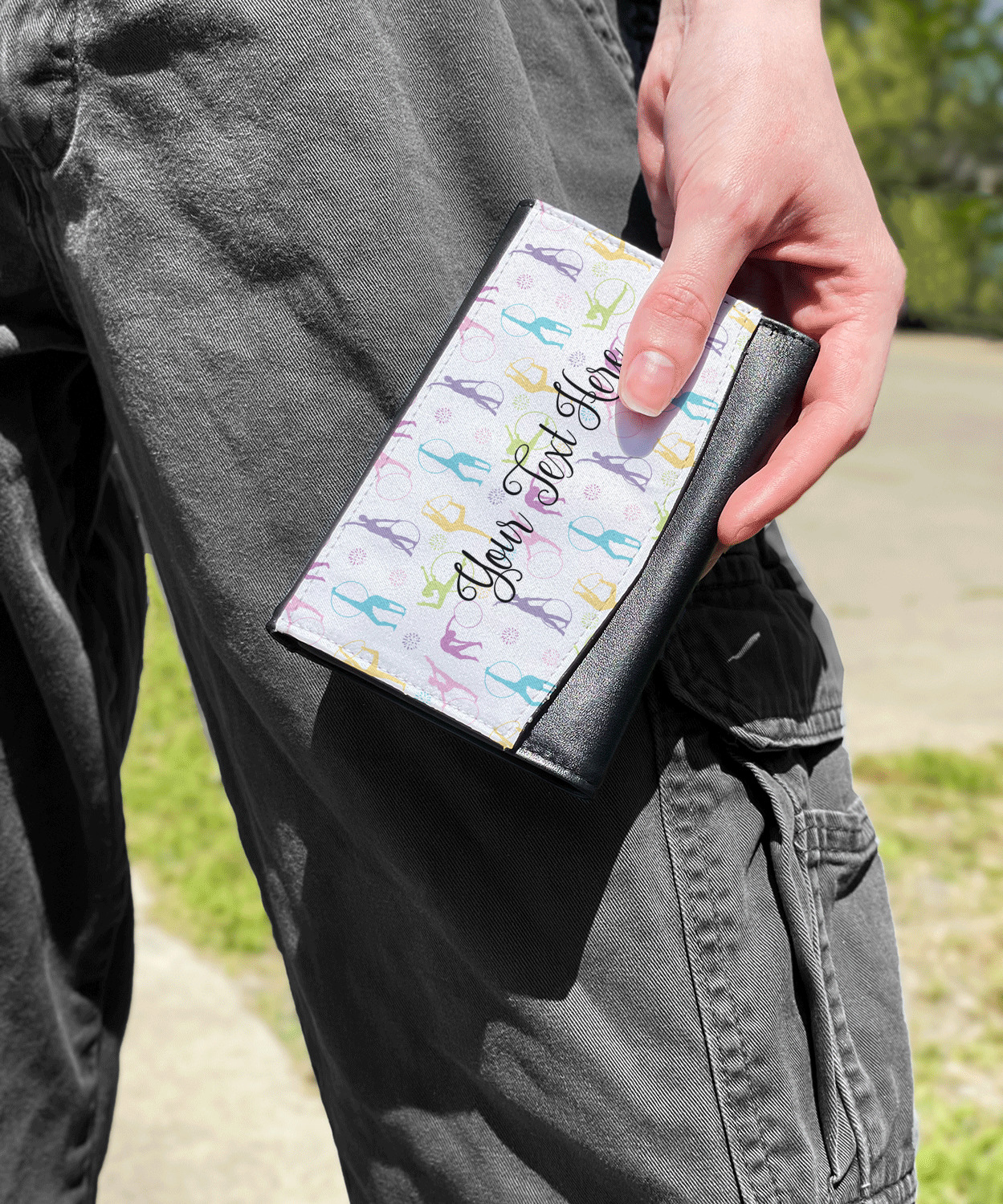 This design template is perfect for gymnasts, their friends and family. The main design features a pattern with gymnasts in pastel colors, some flowers and a white background. The optional personalization is name / text.