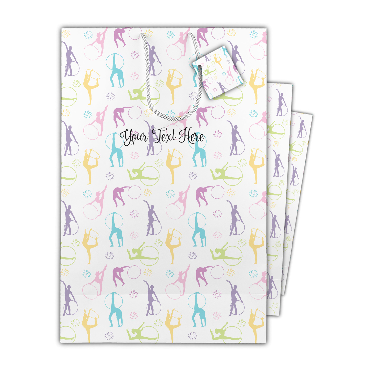 This design template is perfect for gymnasts, their friends and family. The main design features a pattern with gymnasts in pastel colors, some flowers and a white background. The optional personalization is name / text.
