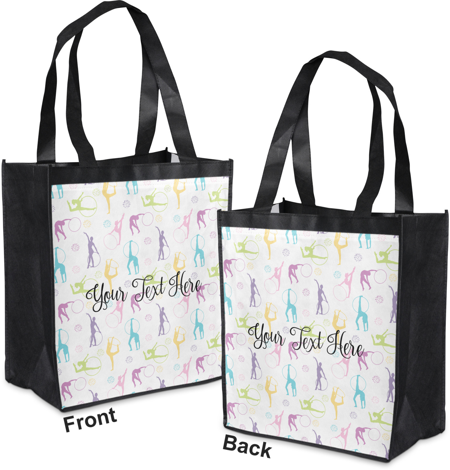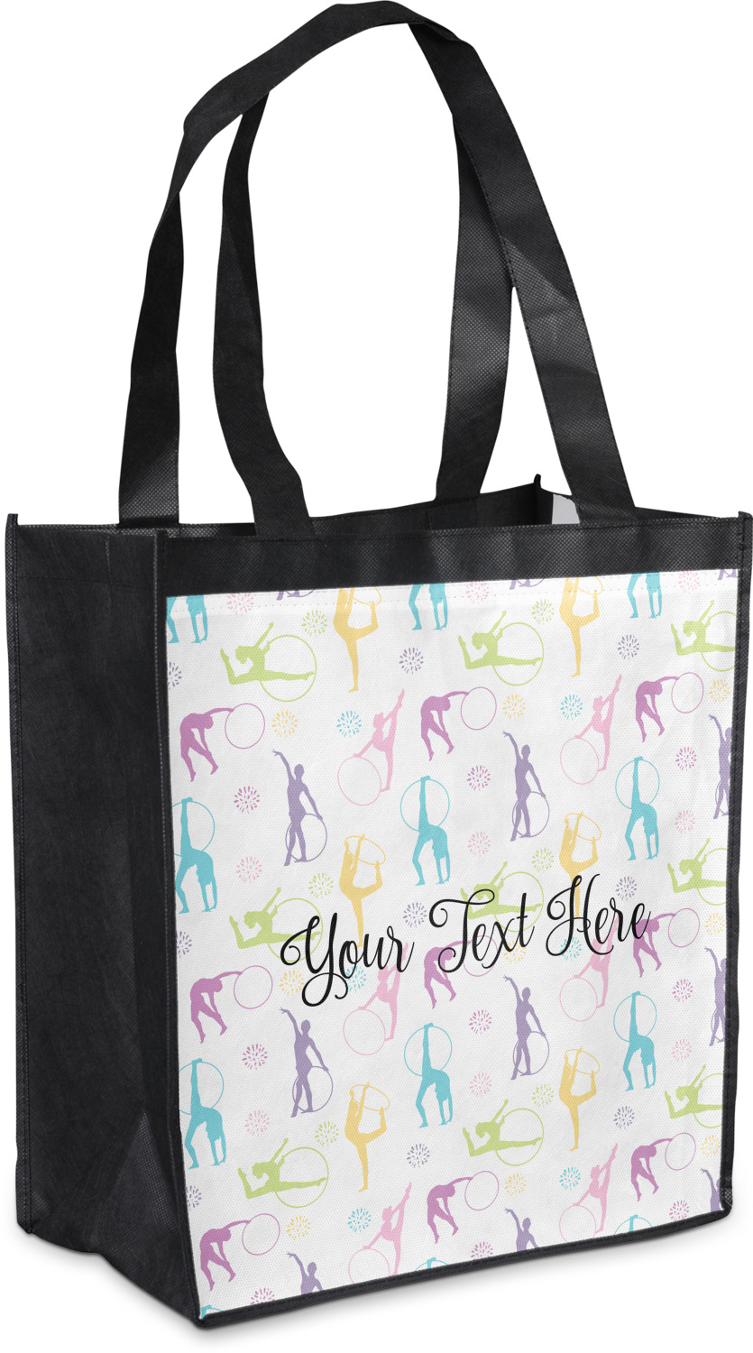 Made from a durable, biodegradable material, these reusable shopping bags can support up to 30 pounds of weight. With two large handles, measuring at 8.5 inches each, these personalized tote bags are easy to carry to your vehicle or home. The bag itself is 12 by 13.5 inches, and can expand to a depth of 7 inches. Your customization is printed on both the front and back, while the remaining sides, trim, and handle are a sleek, charcoal black.