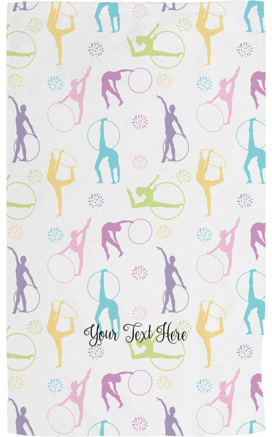 This design template is perfect for gymnasts, their friends and family. The main design features a pattern with gymnasts in pastel colors, some flowers and a white background. The optional personalization is name / text.