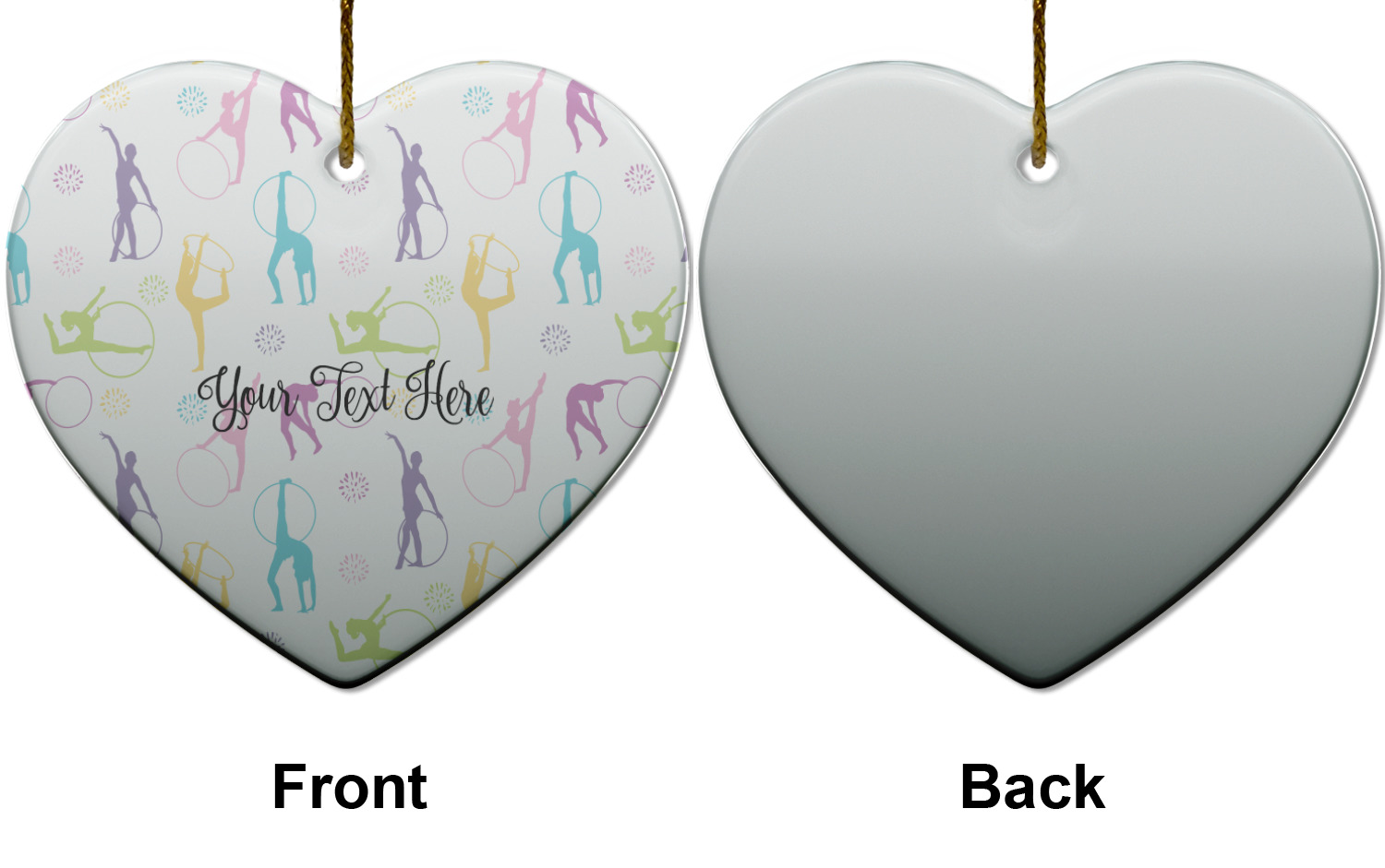 This design template is perfect for gymnasts, their friends and family. The main design features a pattern with gymnasts in pastel colors, some flowers and a white background. The optional personalization is name / text.