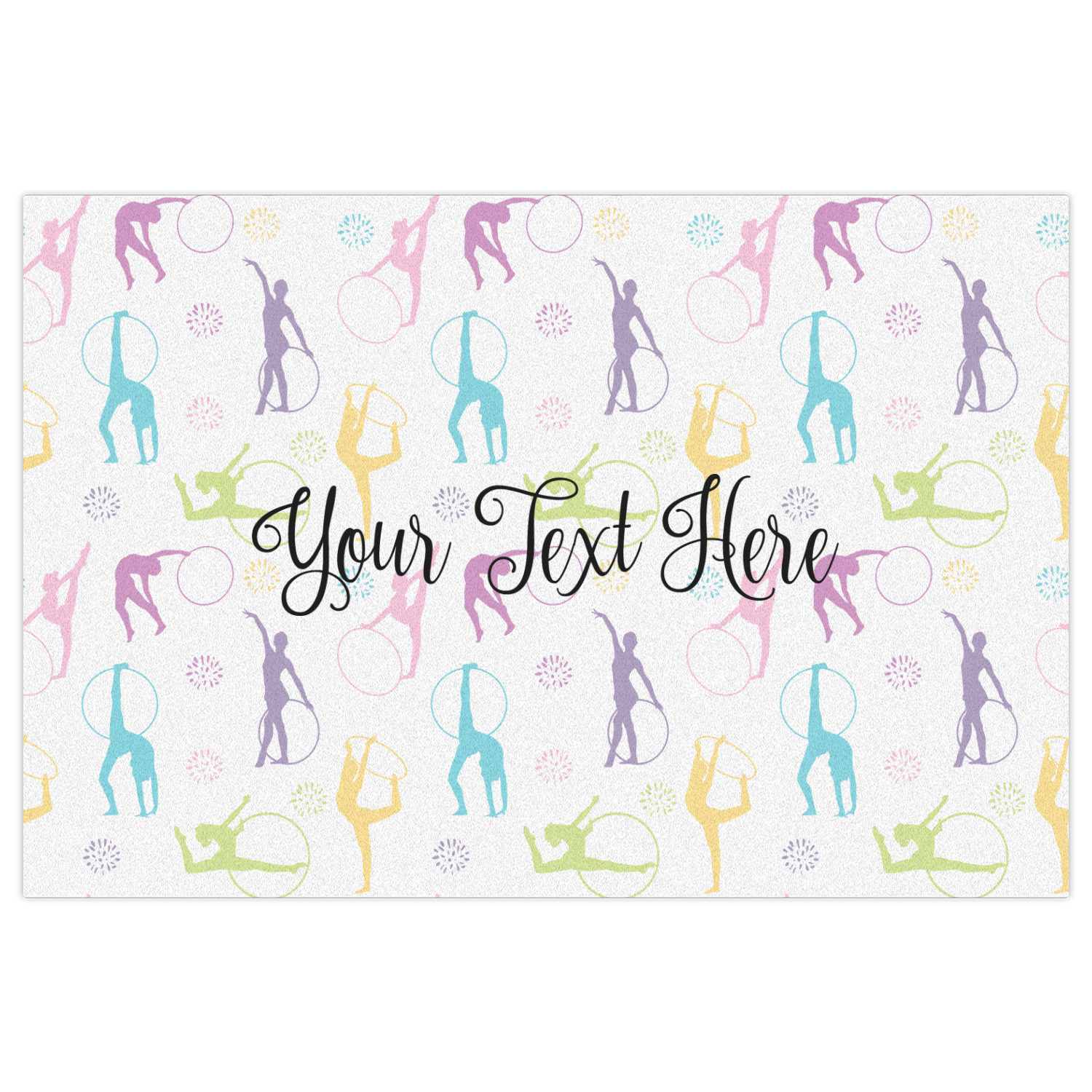This design template is perfect for gymnasts, their friends and family. The main design features a pattern with gymnasts in pastel colors, some flowers and a white background. The optional personalization is name / text.