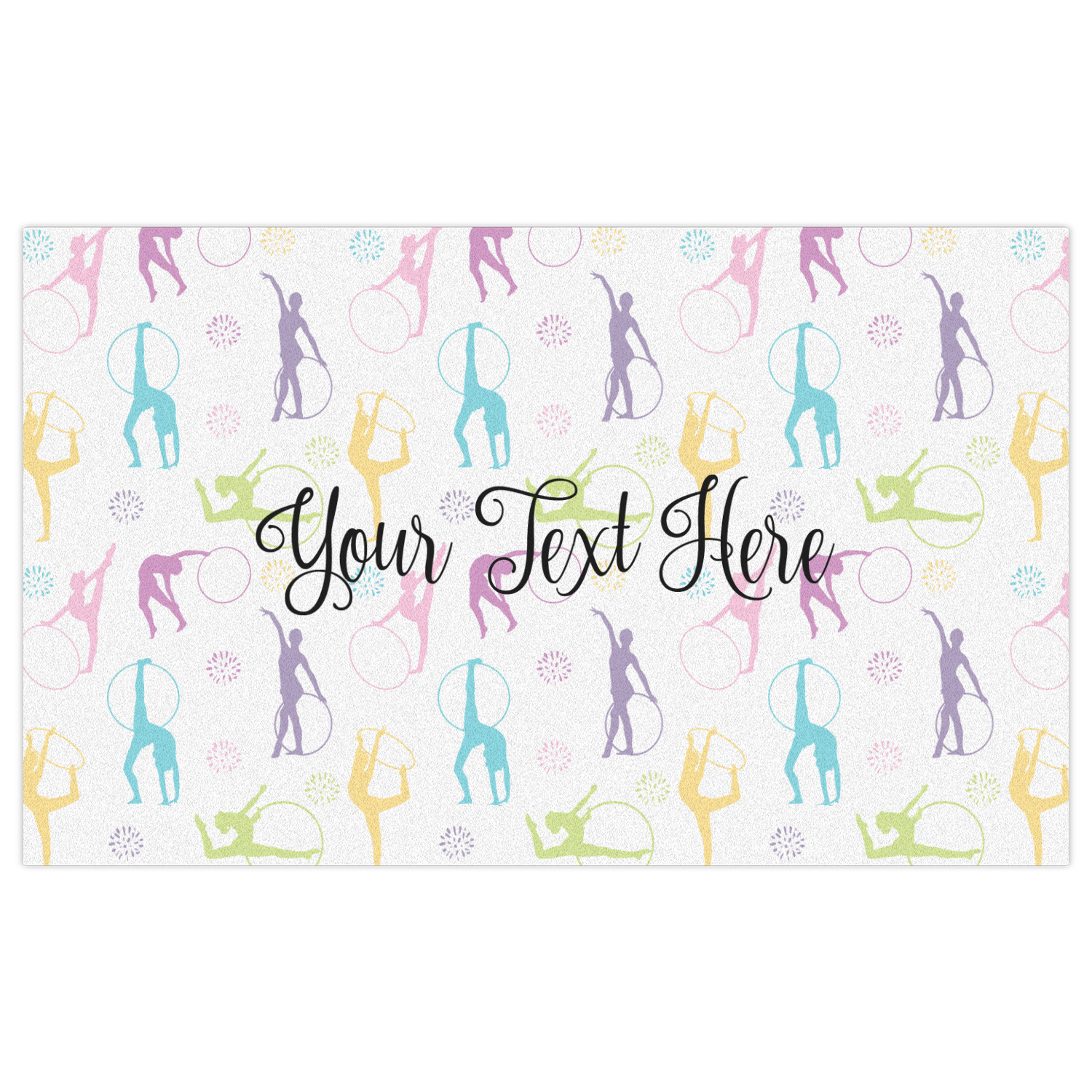 This design template is perfect for gymnasts, their friends and family. The main design features a pattern with gymnasts in pastel colors, some flowers and a white background. The optional personalization is name / text.