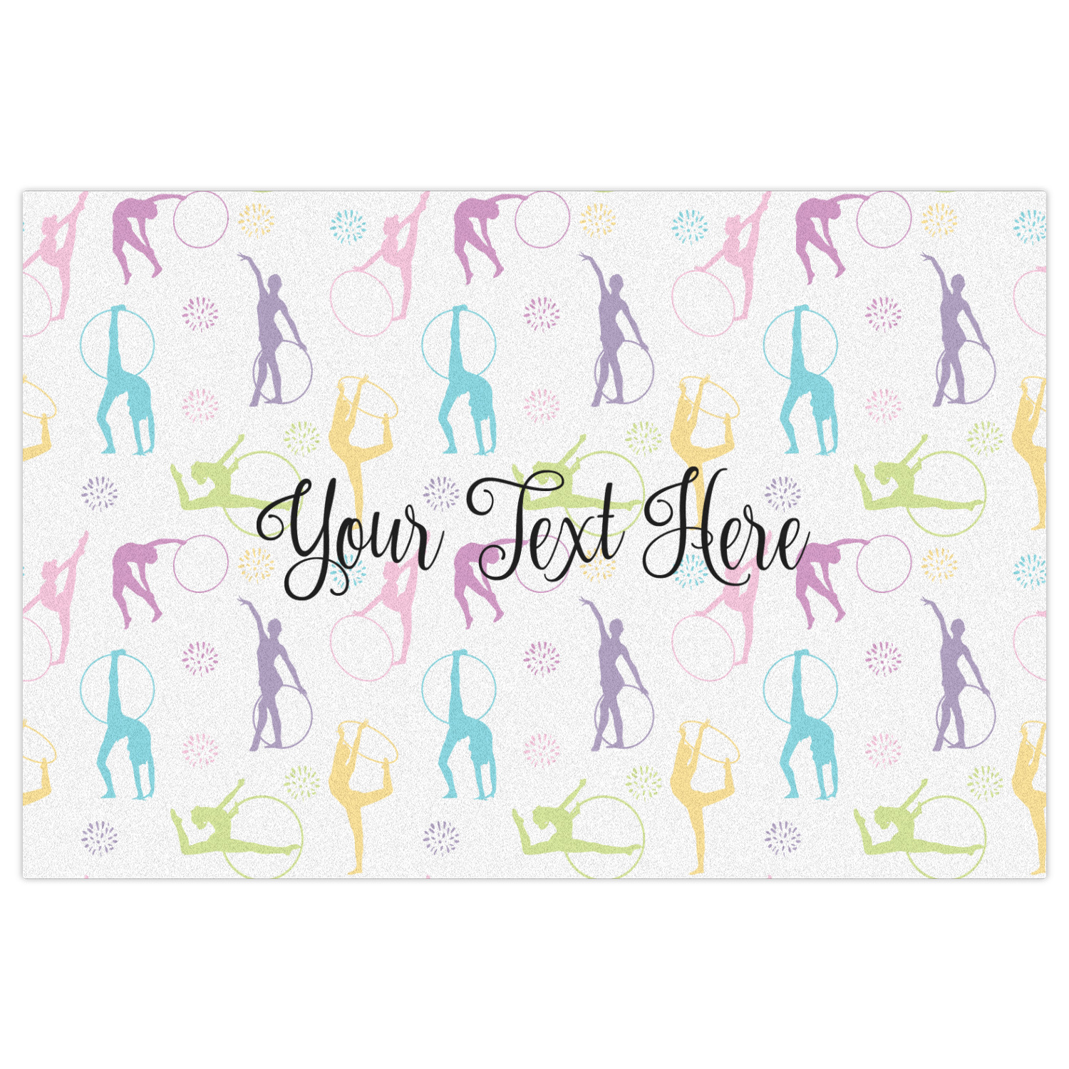 This design template is perfect for gymnasts, their friends and family. The main design features a pattern with gymnasts in pastel colors, some flowers and a white background. The optional personalization is name / text.