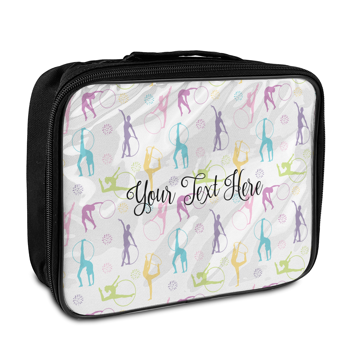 This design template is perfect for gymnasts, their friends and family. The main design features a pattern with gymnasts in pastel colors, some flowers and a white background. The optional personalization is name / text.