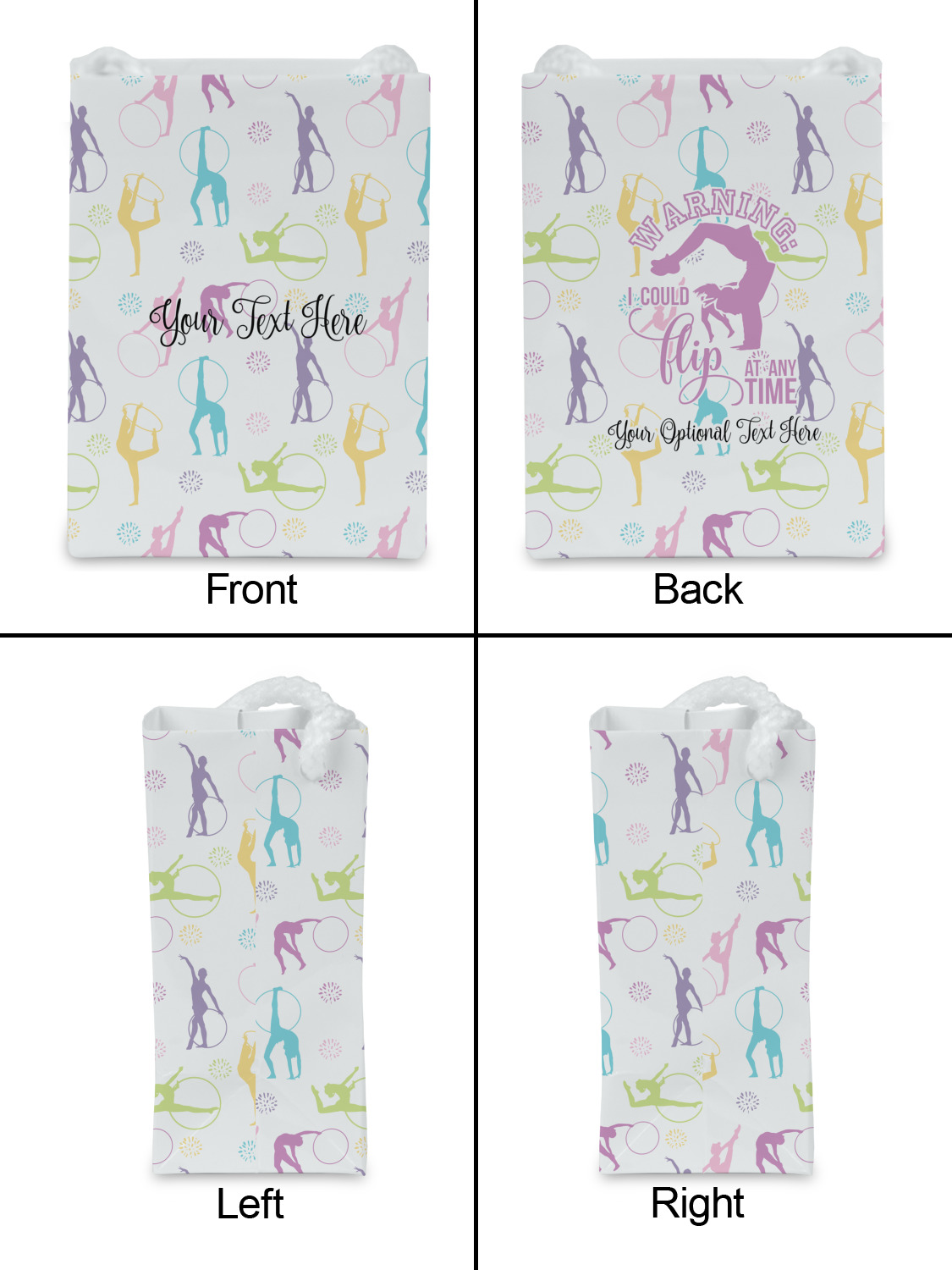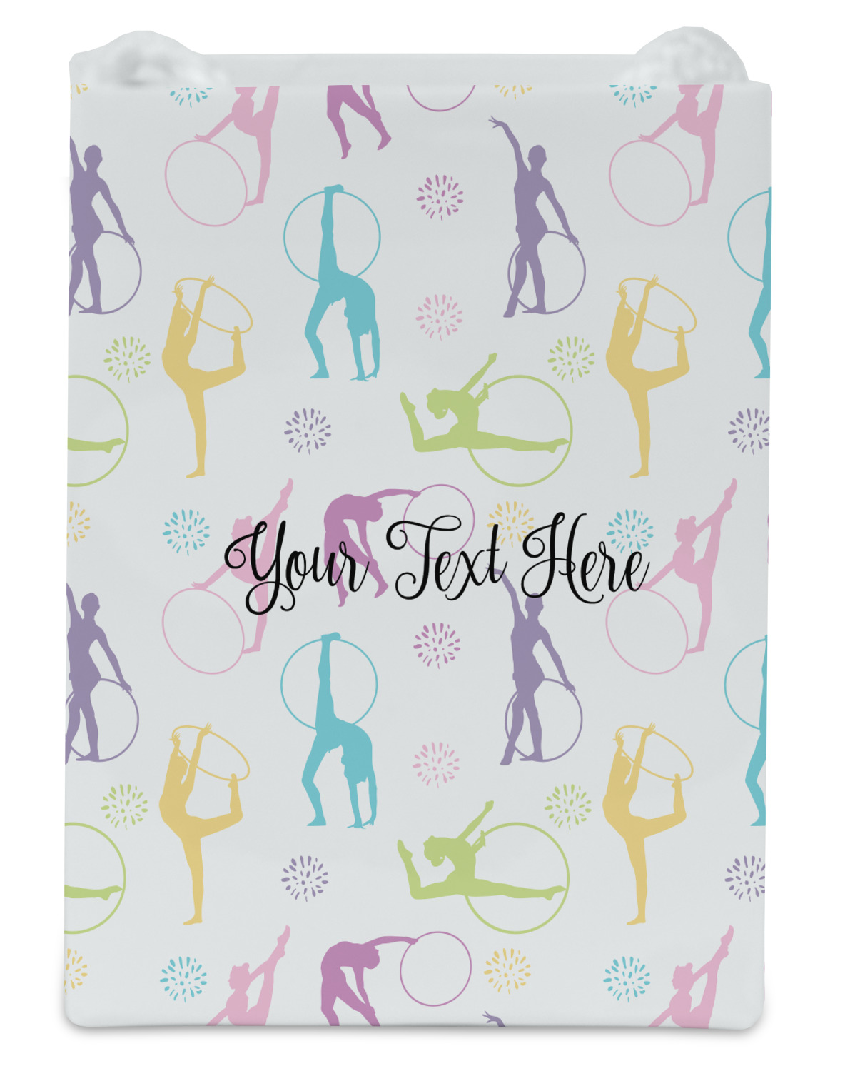 This design template is perfect for gymnasts, their friends and family. The main design features a pattern with gymnasts in pastel colors, some flowers and a white background. The optional personalization is name / text.