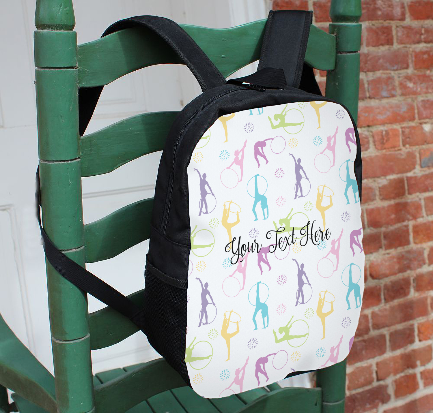 This design template is perfect for gymnasts, their friends and family. The main design features a pattern with gymnasts in pastel colors, some flowers and a white background. The optional personalization is name / text.