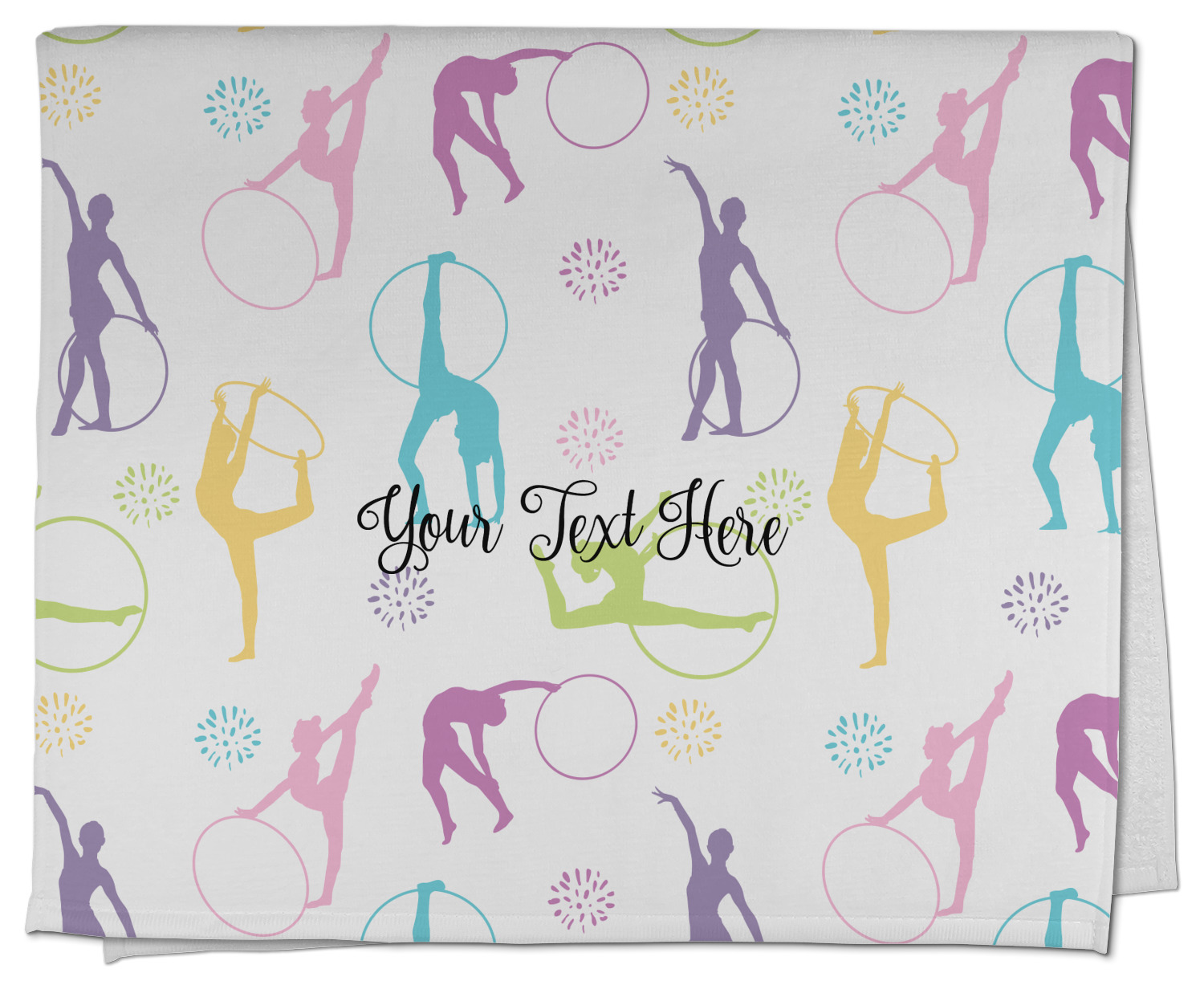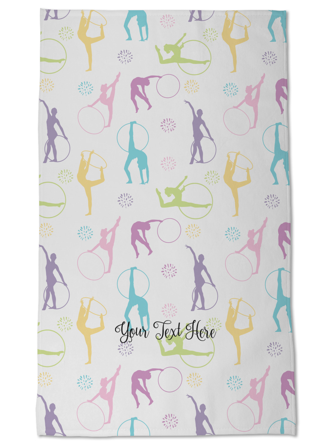 This design template is perfect for gymnasts, their friends and family. The main design features a pattern with gymnasts in pastel colors, some flowers and a white background. The optional personalization is name / text.