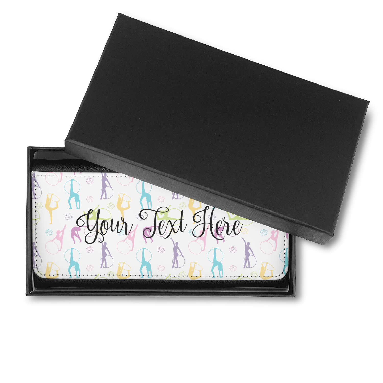This design template is perfect for gymnasts, their friends and family. The main design features a pattern with gymnasts in pastel colors, some flowers and a white background. The optional personalization is name / text.