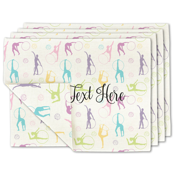 This design template is perfect for gymnasts, their friends and family. The main design features a pattern with gymnasts in pastel colors, some flowers and a white background. The optional personalization is name / text.