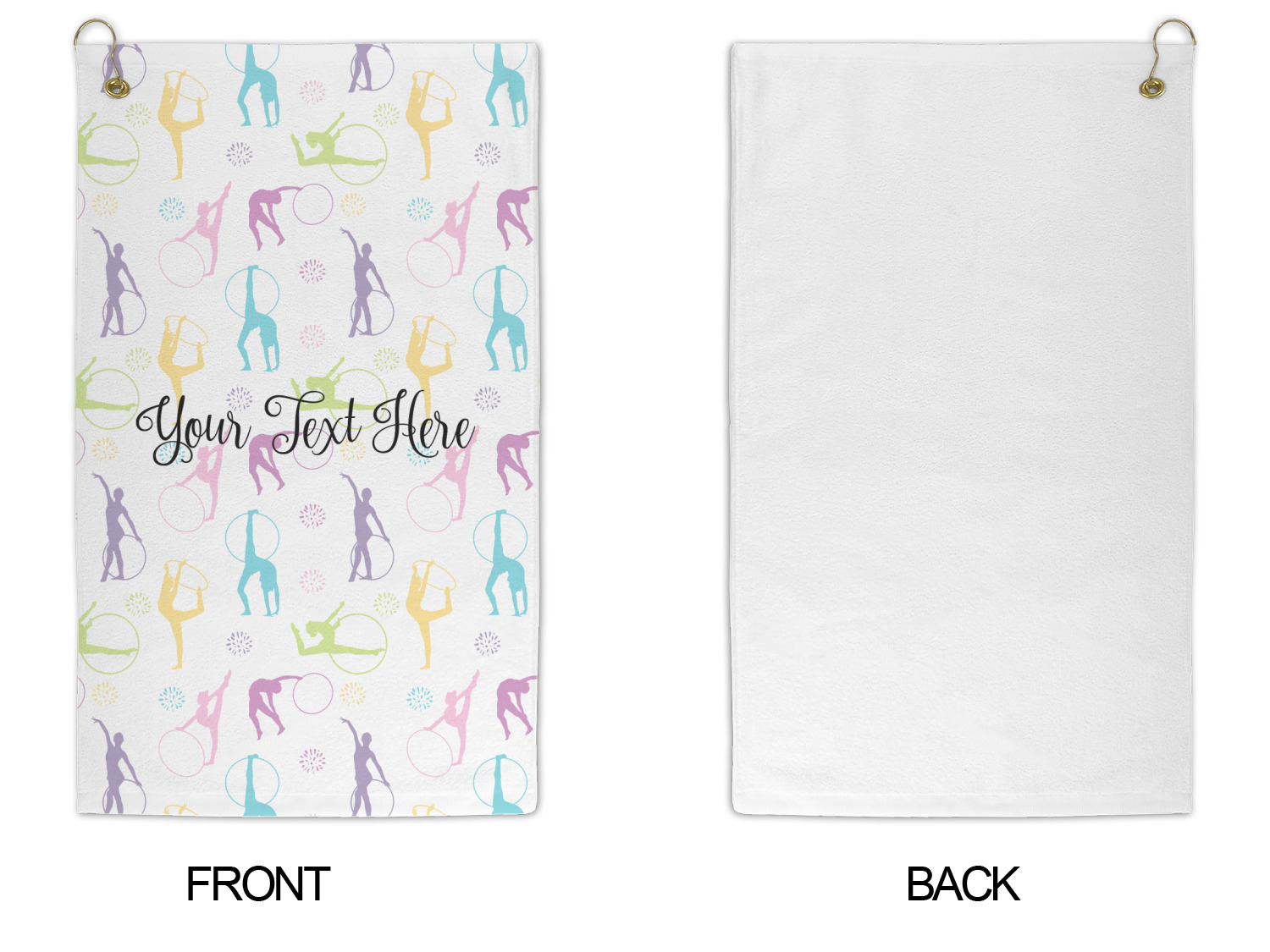 This design template is perfect for gymnasts, their friends and family. The main design features a pattern with gymnasts in pastel colors, some flowers and a white background. The optional personalization is name / text.