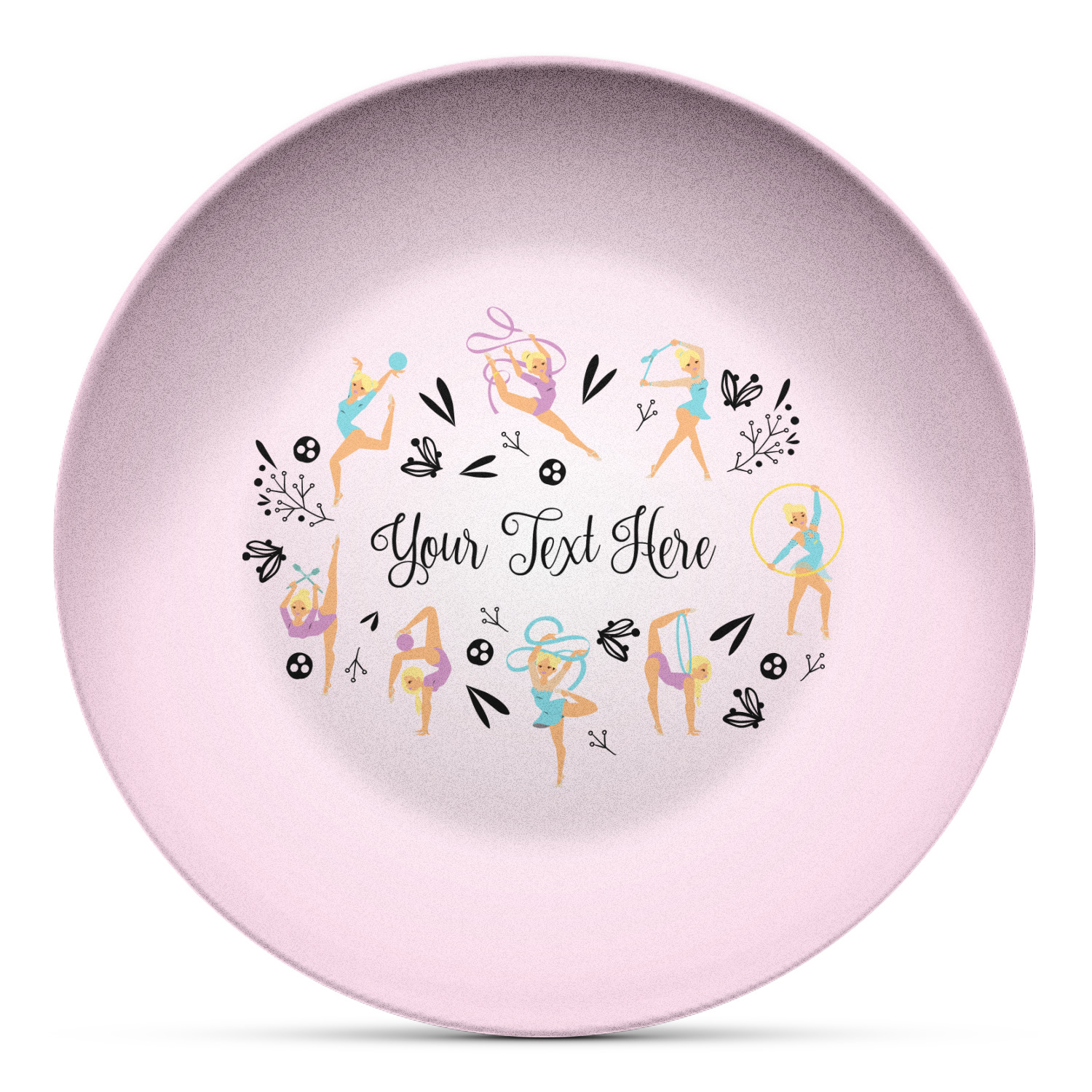 This design template is perfect for gymnasts, their friends and family. The main design features a pattern with gymnasts in pastel colors, some flowers and a white background. The optional personalization is name / text.