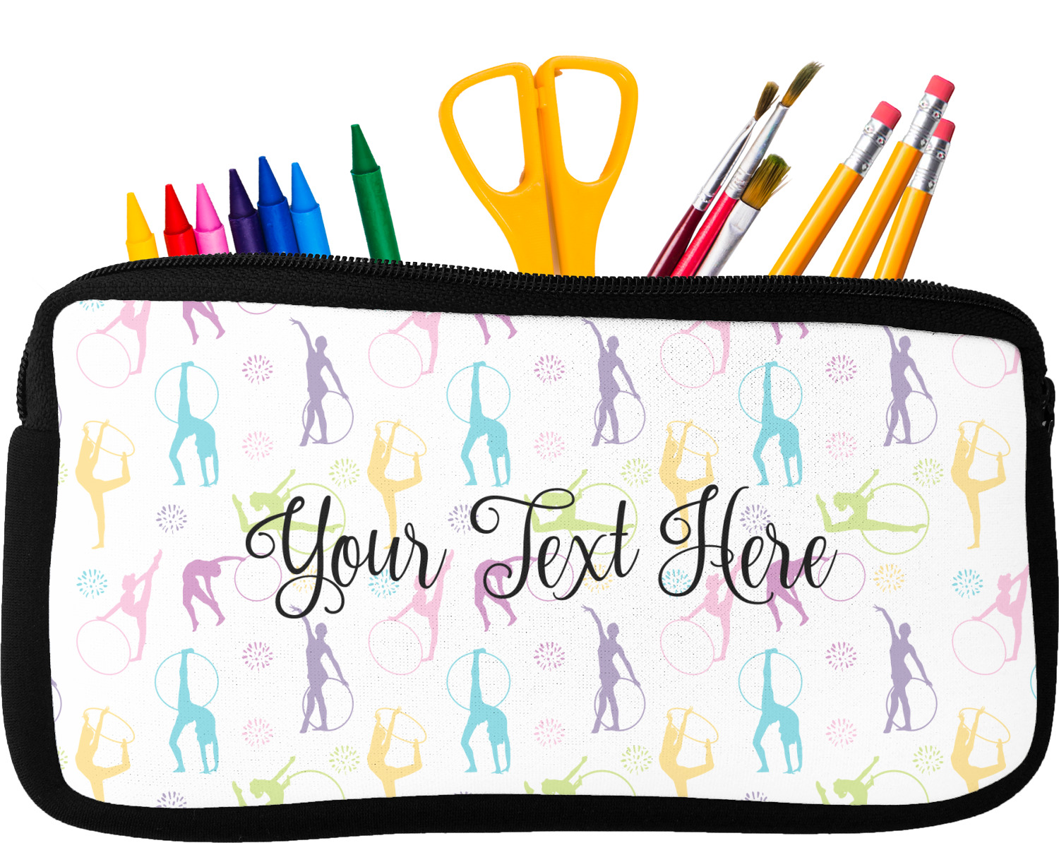 Built from durable neoprene, these pencil pouches, are water resistant, and prevent leaking ink from spilling into your backpack or purse. These custom pencil cases secure with a robust, black zipper. We print your personalized design on the front of this pouch, while the remaining sides a simple black color. These colored pencil cases [880] are sold in two sizes; our smaller version measures at 8.5 by 4.5 inches, while the medium measures at 10.5 by 6.5 inches. The smaller size is more suitable for holding pencils and pens, while our medium size can accommodate pencil sharpeners, scissors, and erasers.