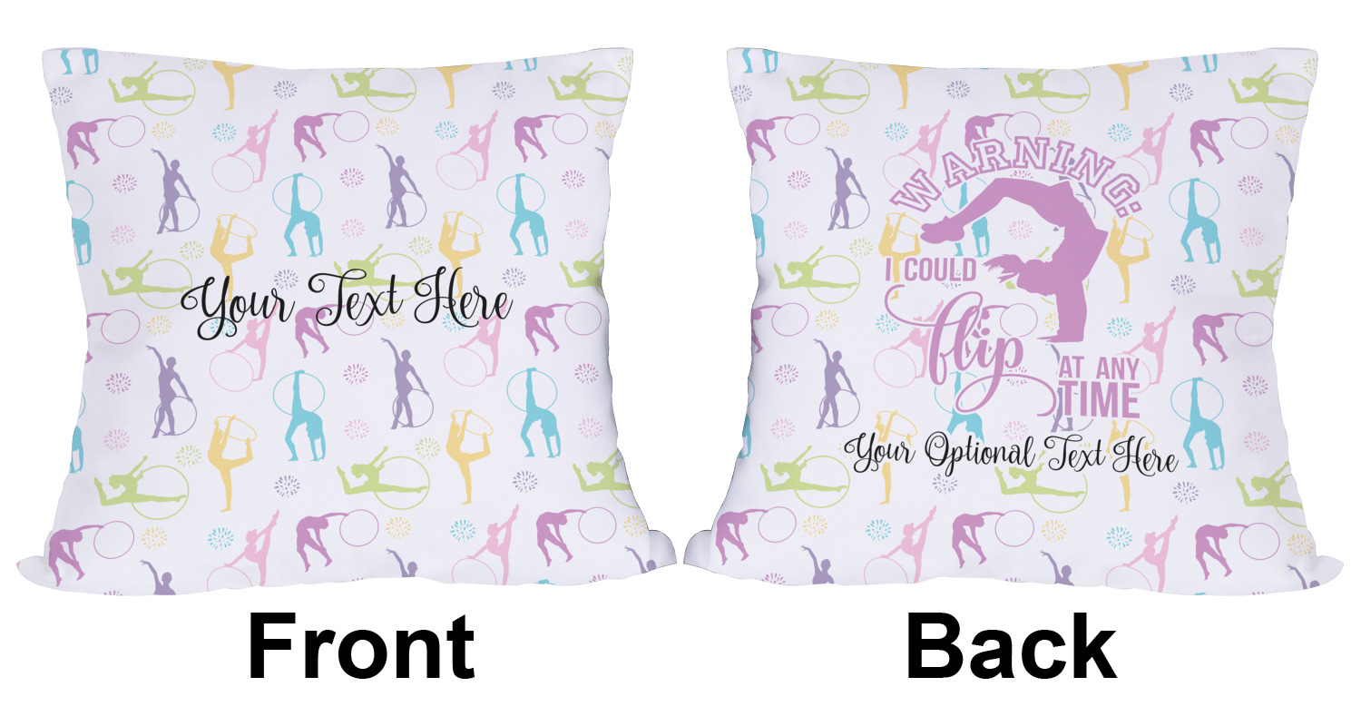 This design template is perfect for gymnasts, their friends and family. The main design features a pattern with gymnasts in pastel colors, some flowers and a white background. The optional personalization is name / text.
