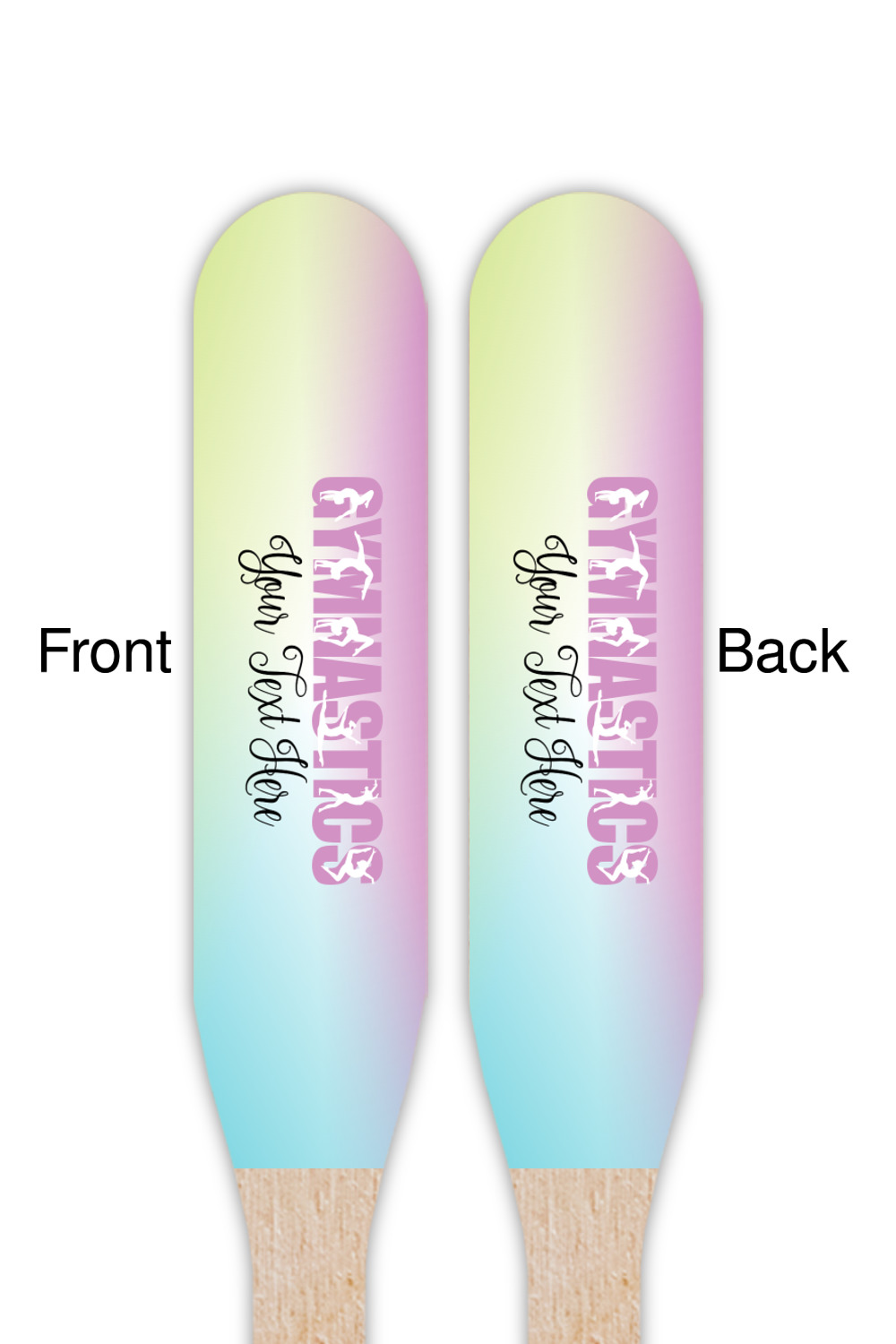 This design template is perfect for gymnasts, their friends and family. The main design features a pattern with gymnasts in pastel colors, some flowers and a white background. The optional personalization is name / text.