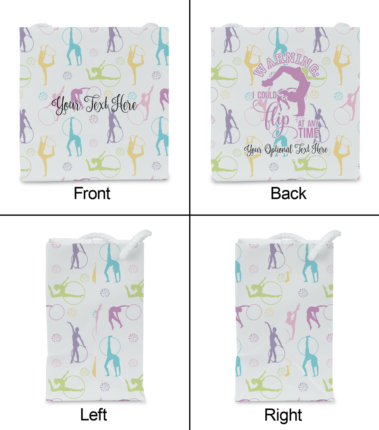 This design template is perfect for gymnasts, their friends and family. The main design features a pattern with gymnasts in pastel colors, some flowers and a white background. The optional personalization is name / text.