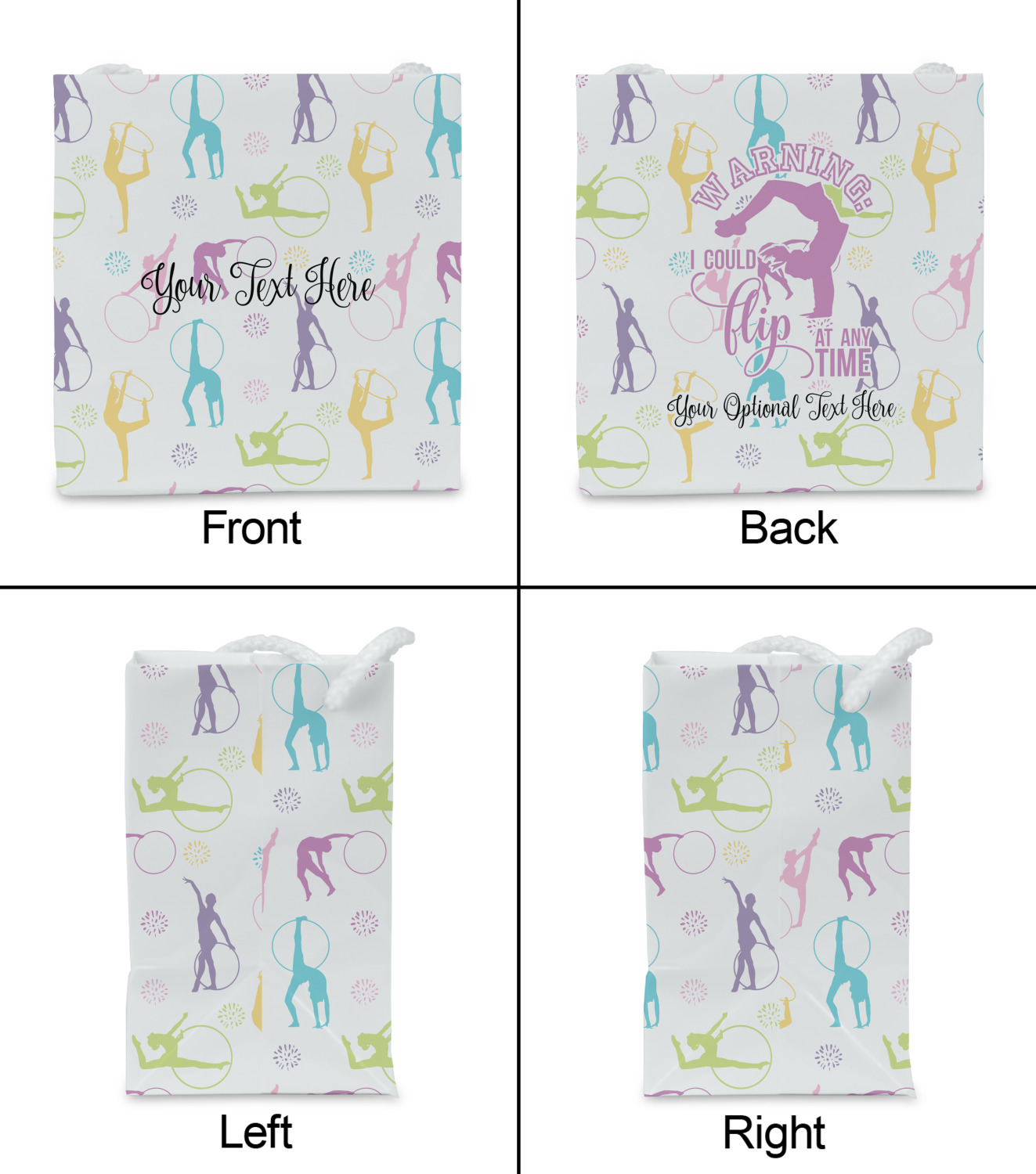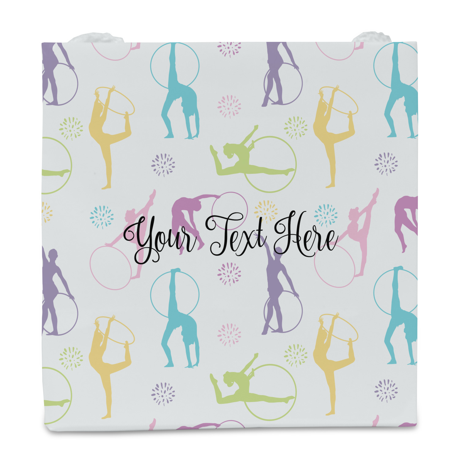 This design template is perfect for gymnasts, their friends and family. The main design features a pattern with gymnasts in pastel colors, some flowers and a white background. The optional personalization is name / text.