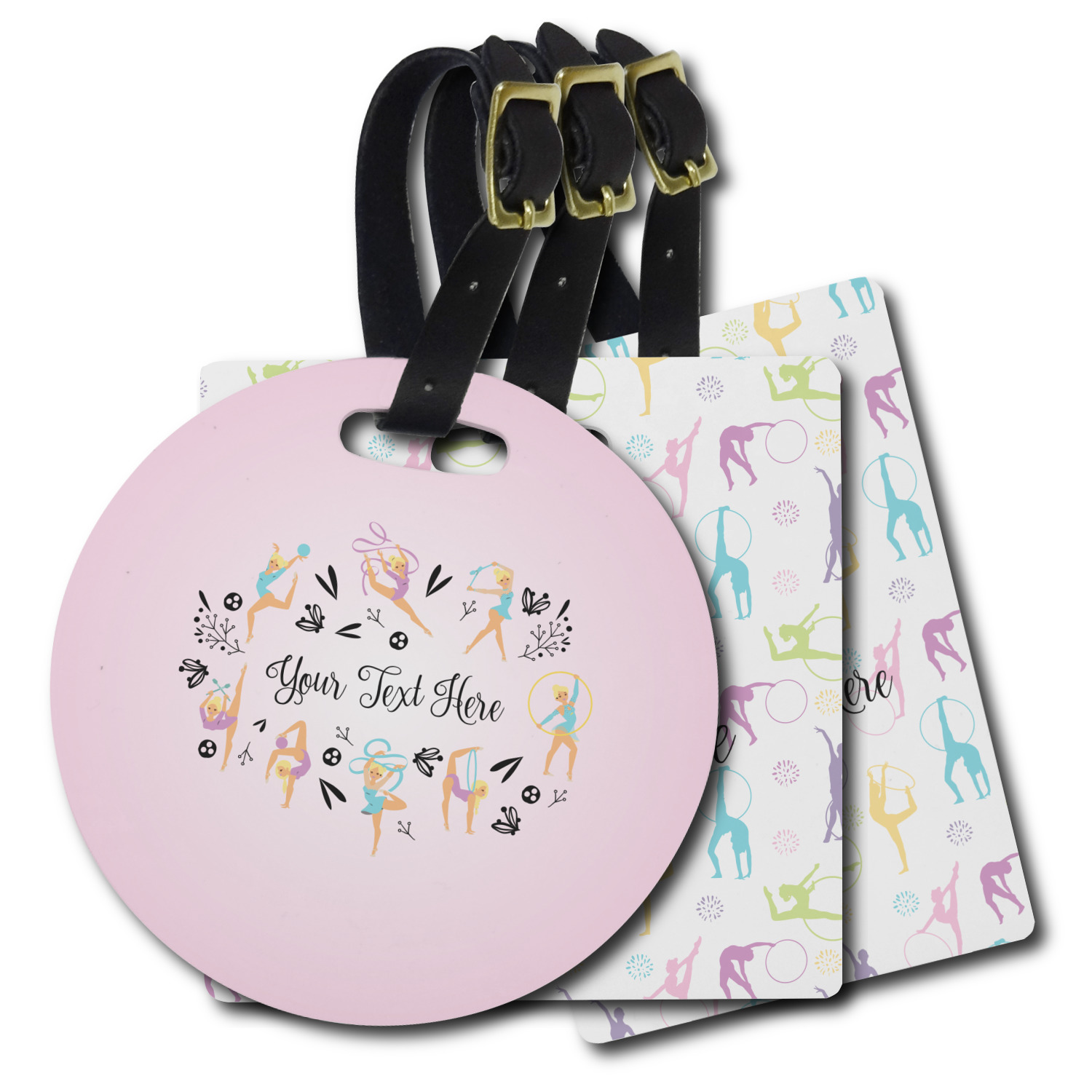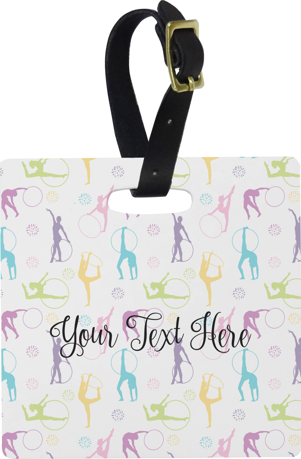 This design template is perfect for gymnasts, their friends and family. The main design features a pattern with gymnasts in pastel colors, some flowers and a white background. The optional personalization is name / text.