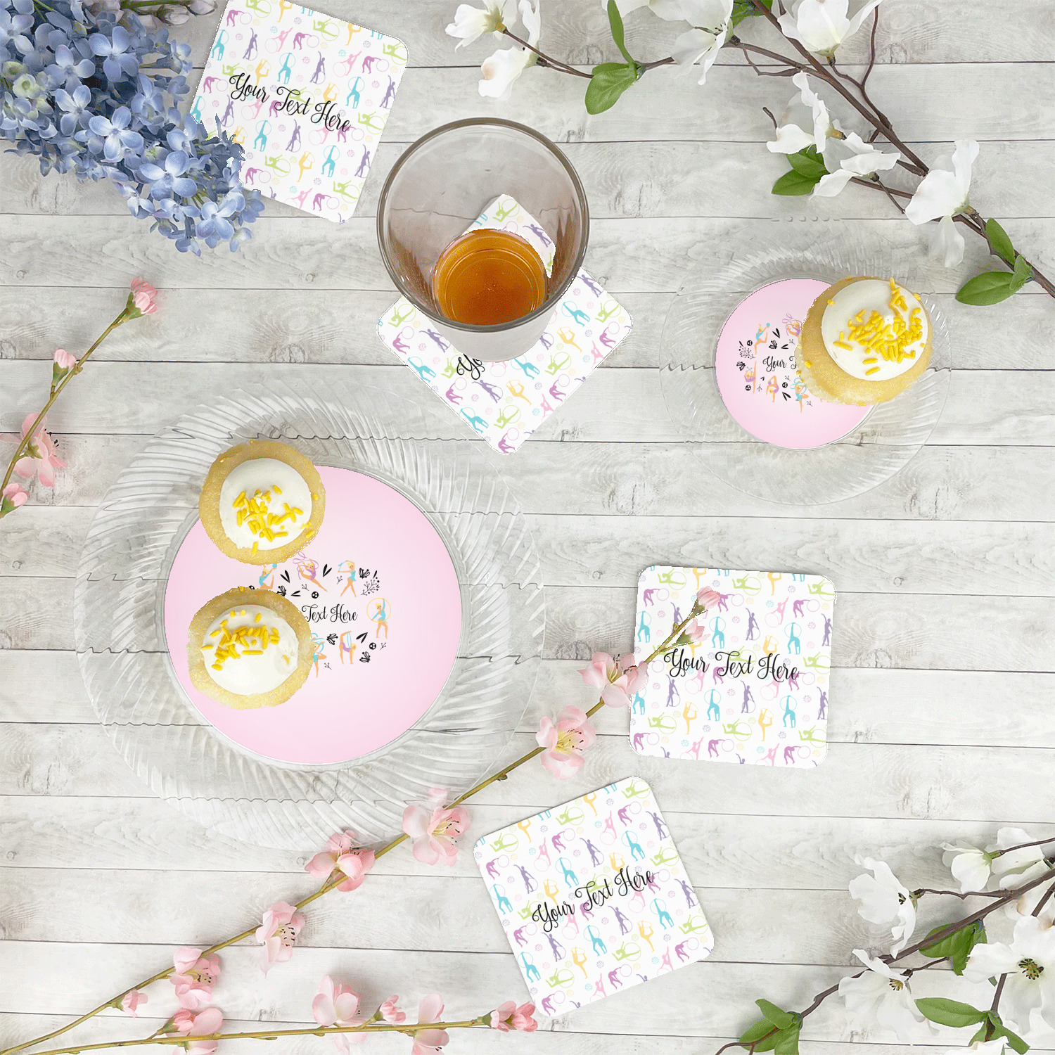 This design template is perfect for gymnasts, their friends and family. The main design features a pattern with gymnasts in pastel colors, some flowers and a white background. The optional personalization is name / text.