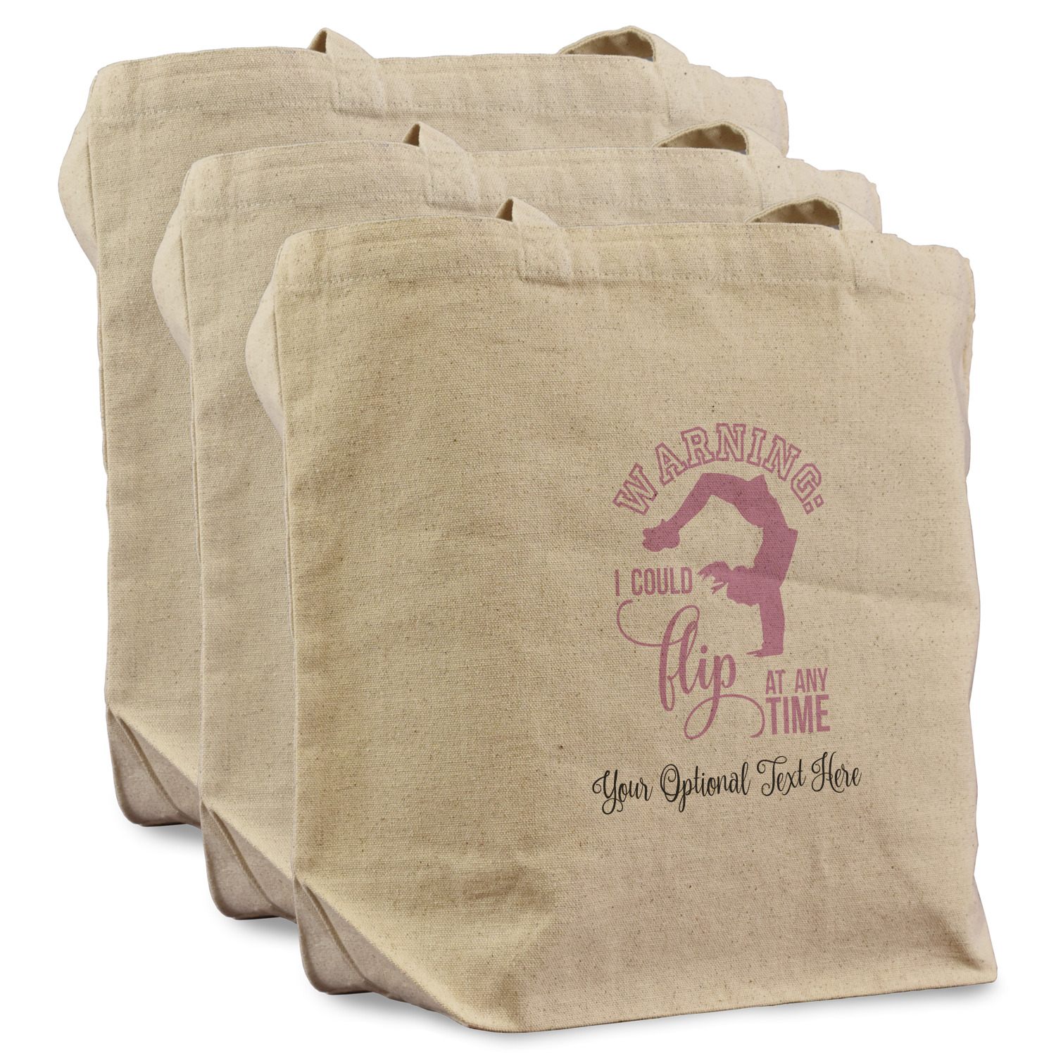Our cotton totes are perfect for groceries, and can also be used to haul other stuff around as well. These totes are slightly larger than an average size tote - these cotton totes are 15" wide by 17" high, and have a 6" bottom gusset, which means they can hold more stuff and bulkier items.