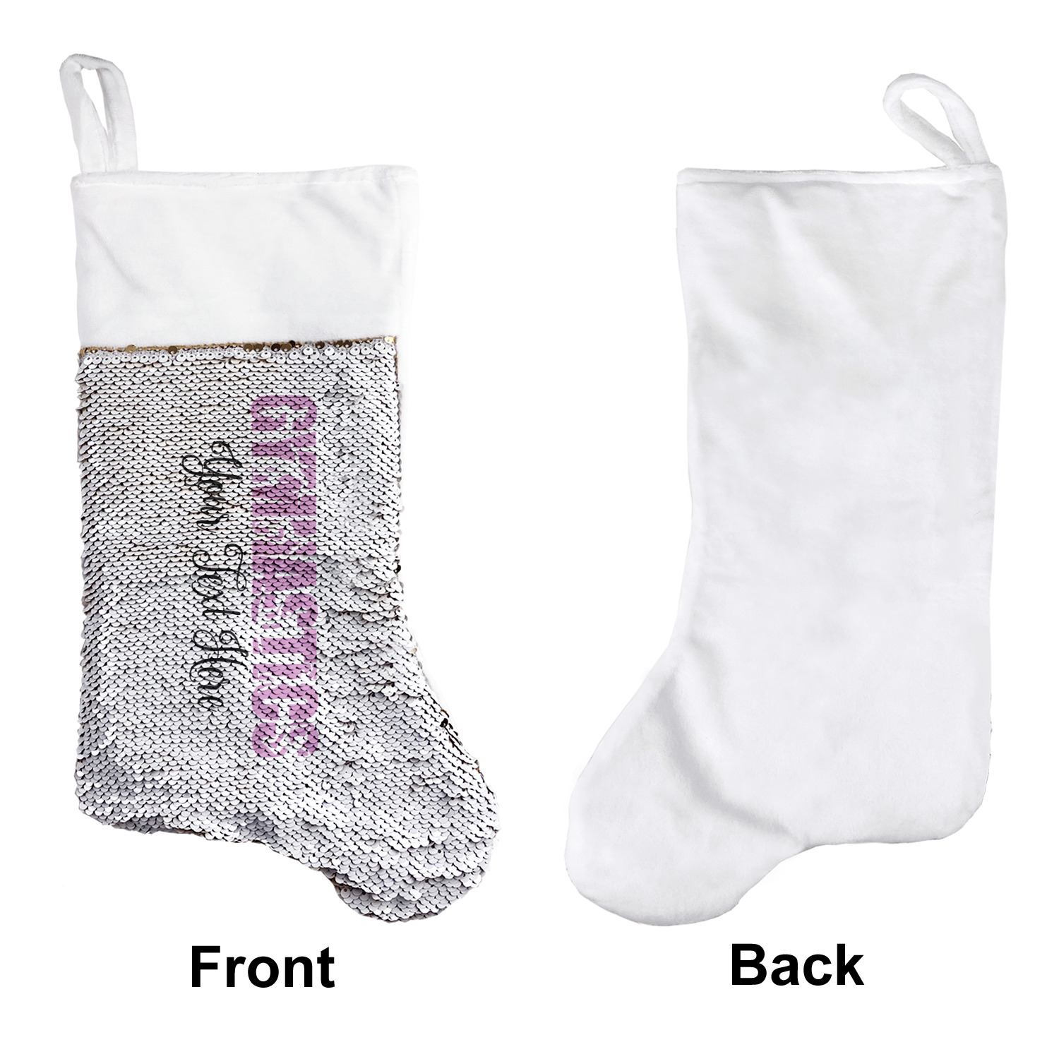 Our fun sequin stockings are made from a soft, yet durable polyester material perfect for any stocking stuffer or holiday decor! Choose from a glamorous gold stocking or classic red sequin stocking for the front color and have your personalized image printed behind for reversible fun! Our sparkly sequin stockings are super fun and decorative perfect for the family and you this holiday! Each stocking is approximately 17" x 9" with a durable loop for hanging and printed here in the US.