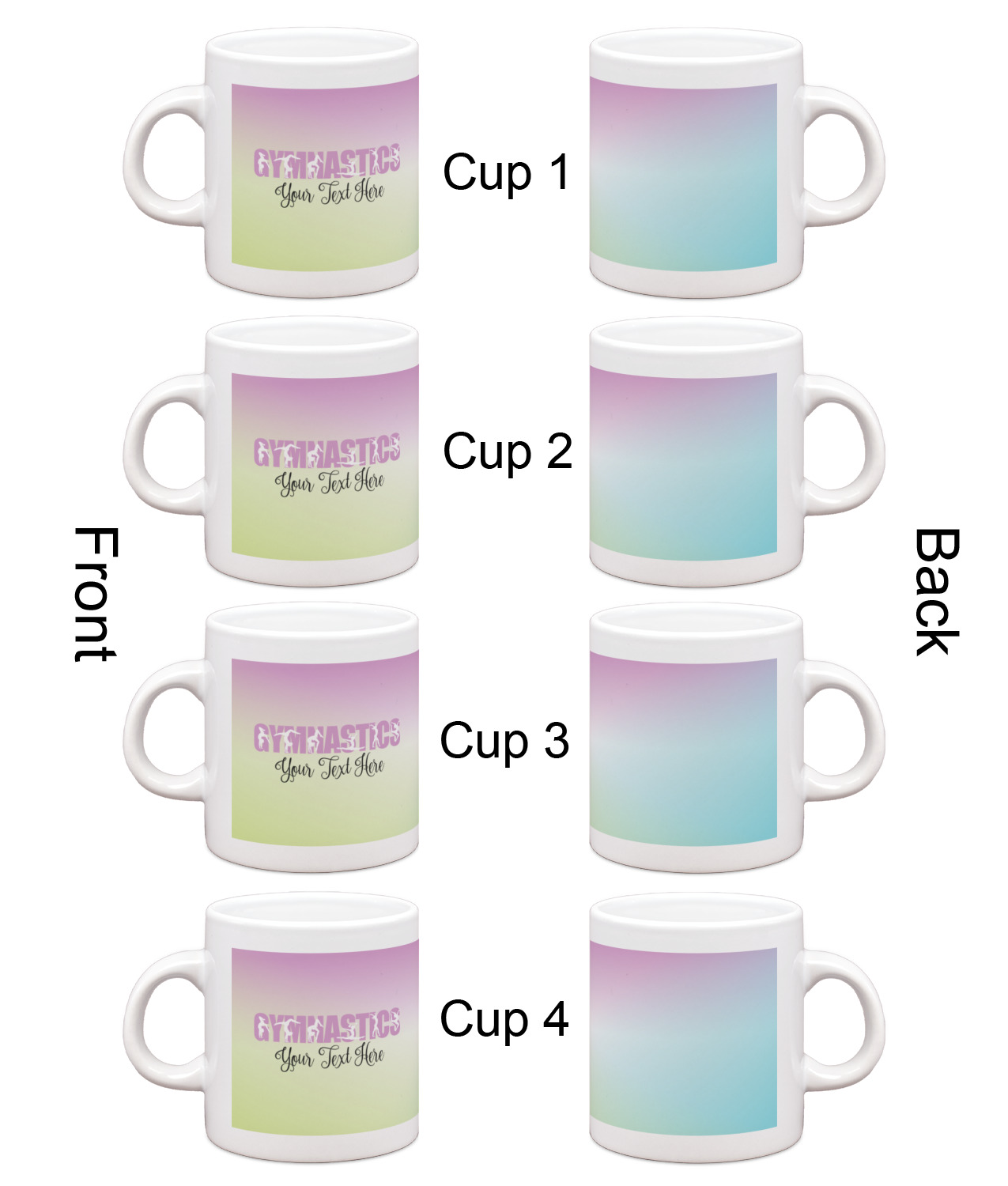 Each of our espresso mugs is a ceramic material sure to keep your drink warm. Personalize one cup for yourself, or order a set of 4! Its the perfect little gift for any coffee lover! We carry two sizes for you to personalize - 3 oz. (approx. 3.25" x 2.325" x 2.625") or 6 oz. (approx. 4" x 2.9" x 2.9"). Our 3 oz. mug is perfect for that single shot espresso while our 6 oz. mug can be your next favorite cappuccino cup holding two shots of espresso!