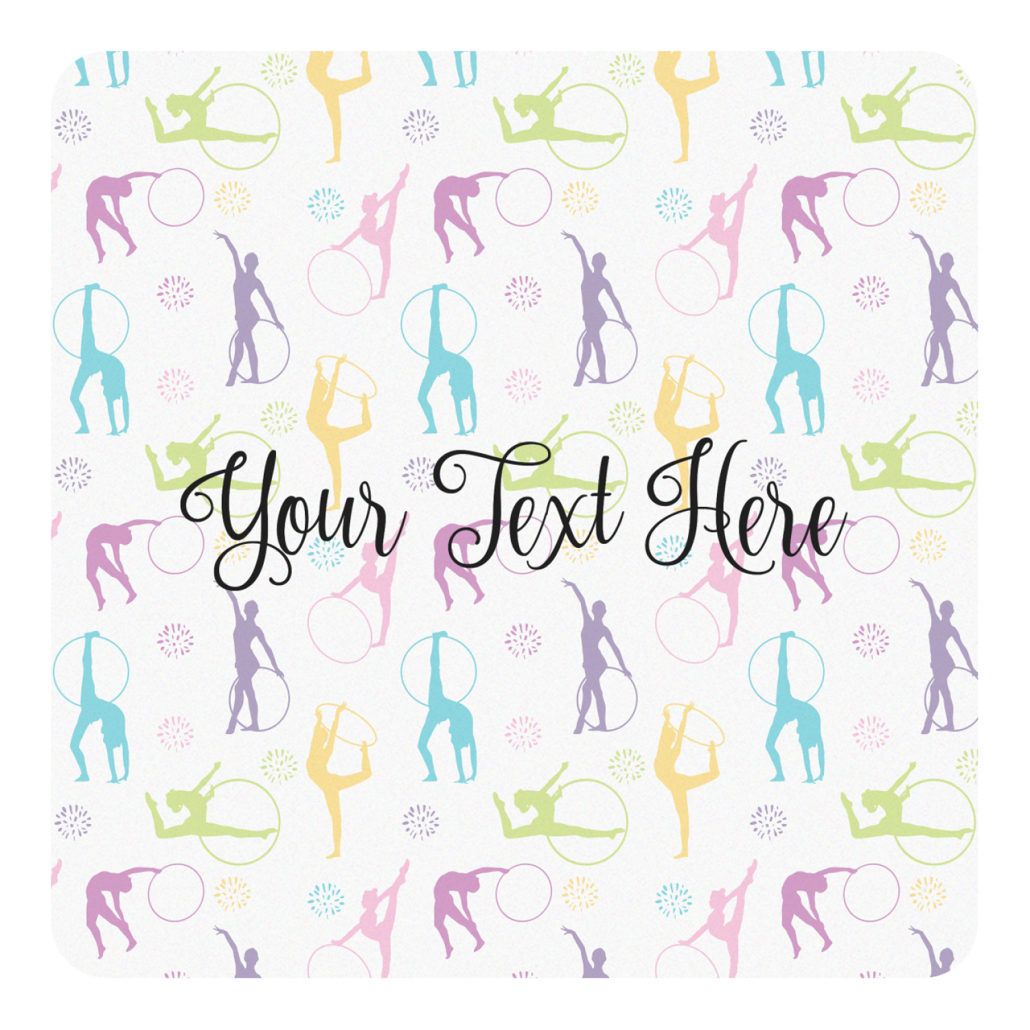 This design template is perfect for gymnasts, their friends and family. The main design features a pattern with gymnasts in pastel colors, some flowers and a white background. The optional personalization is name / text.