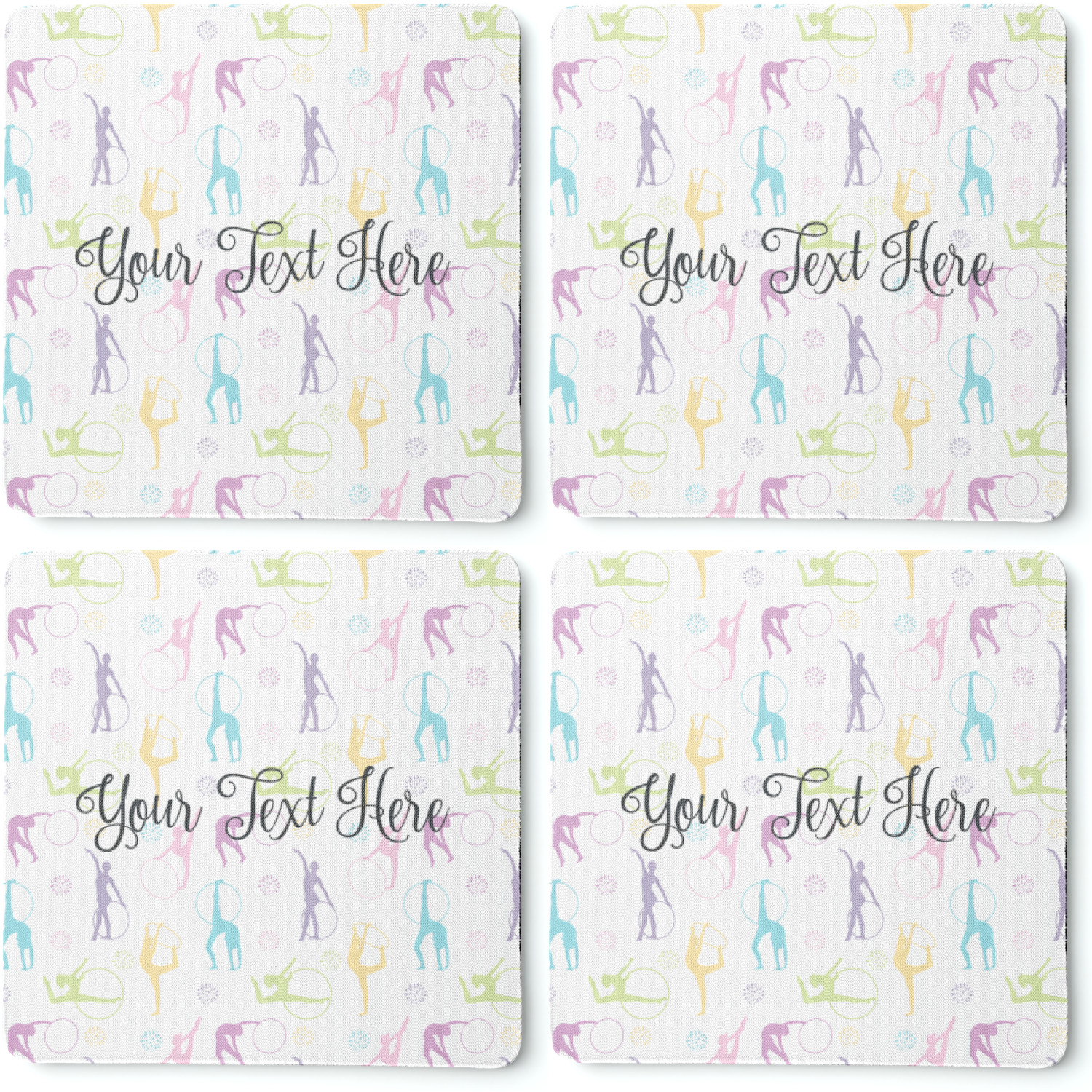 This design template is perfect for gymnasts, their friends and family. The main design features a pattern with gymnasts in pastel colors, some flowers and a white background. The optional personalization is name / text.