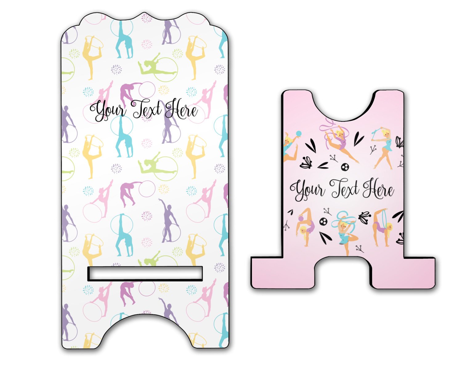 This design template is perfect for gymnasts, their friends and family. The main design features a pattern with gymnasts in pastel colors, some flowers and a white background. The optional personalization is name / text.